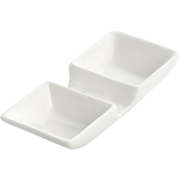 This clever ceramic chopstick rest serves two types of sauces while keeping chopstick tips neatly off the table. Each dish section holds 3/4 oz. of sauce, wasabi or ginger, and the entire piece measures 4.75" x 2" x 1.1". Dishwasher safe.