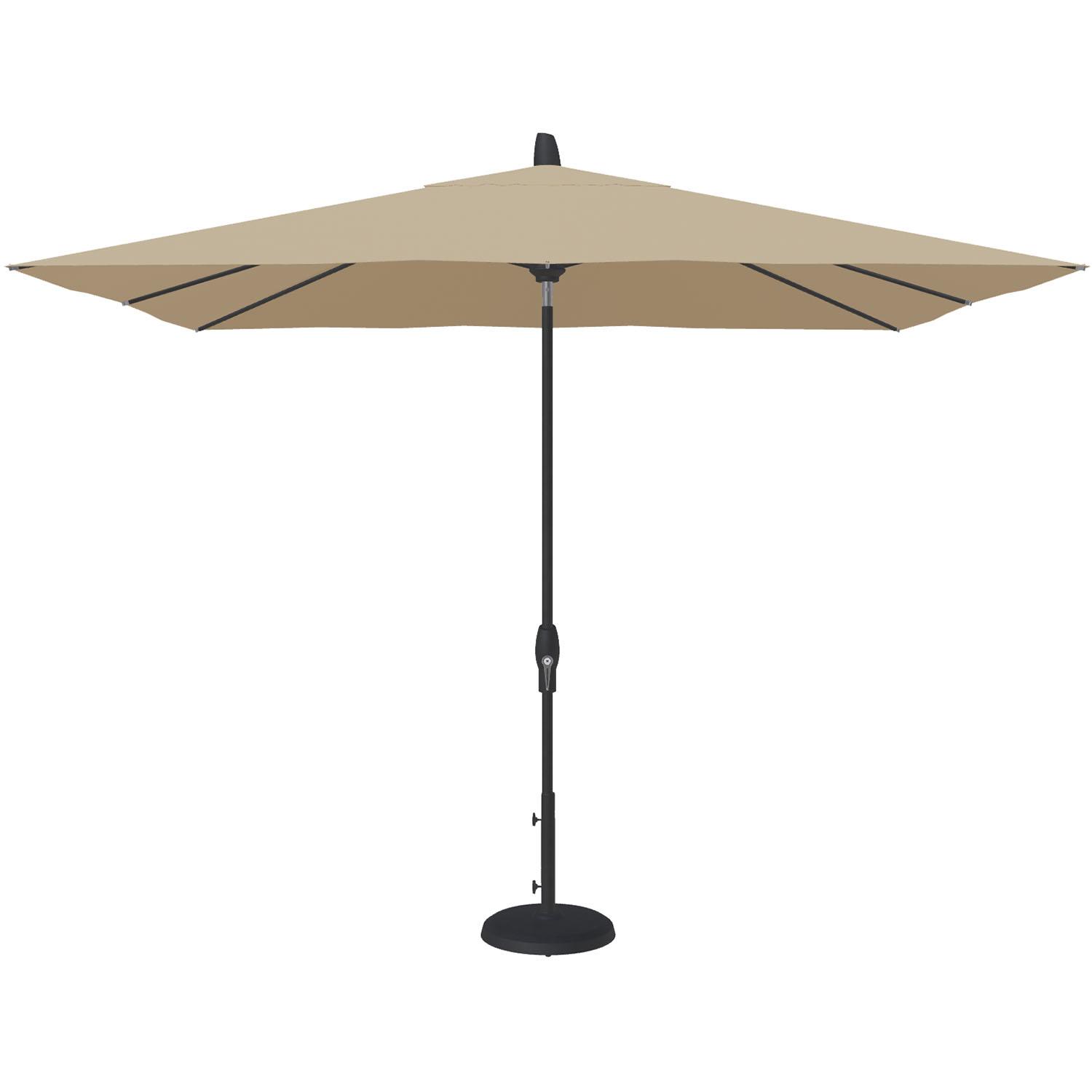 Stay cool in the summer sun under one of our patio umbrellas from Treasure Garden. These umbrellas are superb values, made with weatherproof fabrics, heavy-gauge, black-finished aluminum poles, rugged PVC frames, and zinc-plated hardware. The rectangular umbrellas feature a canopy that measures 8' x 10' for 80 sq. ft. of shade, with an easy-to-use crank handle that both opens the umbrella and tilts it, too, if you wish. Just crank to open and keep cranking to the desired tilt angle. The lift cord is made of rugged Kevlar mesh.The fabrics used are all 100% solution-dyed synthetics, resistant to both moisture and sun, and are woven of polyester or acrylic fibers. They will not rot, mildew nor fade and can be cleaned in place with soap and water. Each umbrella is supported by 8 ribs, features a single wind vent for stability and stands 109" tall. An umbrella stand is essential for safe use.
