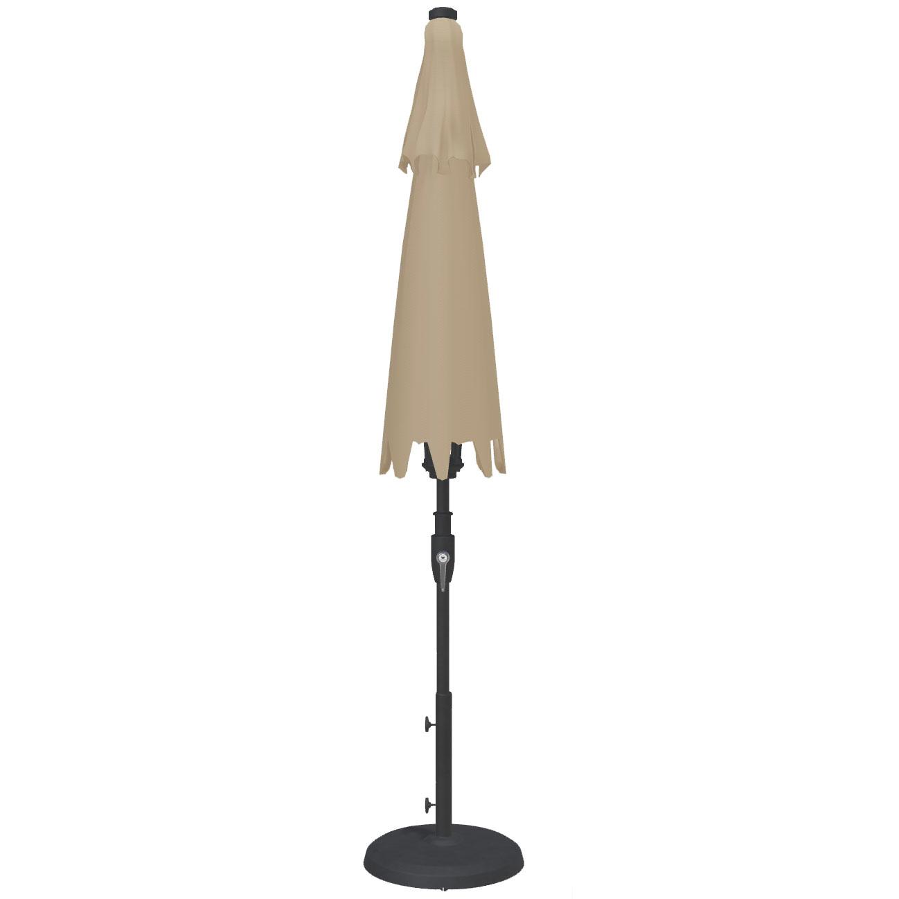 Stay cool in the summer sun under one of our patio umbrellas from Treasure Garden. These umbrellas are superb values, made with weatherproof fabrics, heavy-gauge aluminum poles, rugged PVC frames, and zinc-plated hardware. The 9-ft. diameter umbrellas feature an easy-to-use crank handle to open and close the umbrella and a simple, sliding collar mechanism on the pole to tilt the canopy, so your shade can follow the sun at any angle. The lift cord is made of rugged Kevlar mesh. The fabrics used are all 100% solution-dyed synthetics, resistant to both moisture and sun, and are woven of polyester or acrylic fibers. They will not rot, mildew nor fade and can be cleaned in place with soap and water. Each umbrella is supported by 8 ribs, features a single wind vent for stability and stands 96" tall. The pole features a black, powder-coat finish. An umbrella stand is essential for safe use and is sold separately.