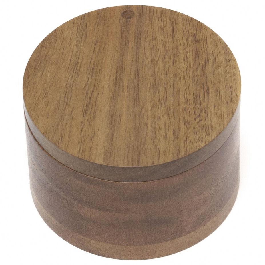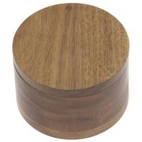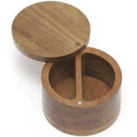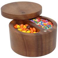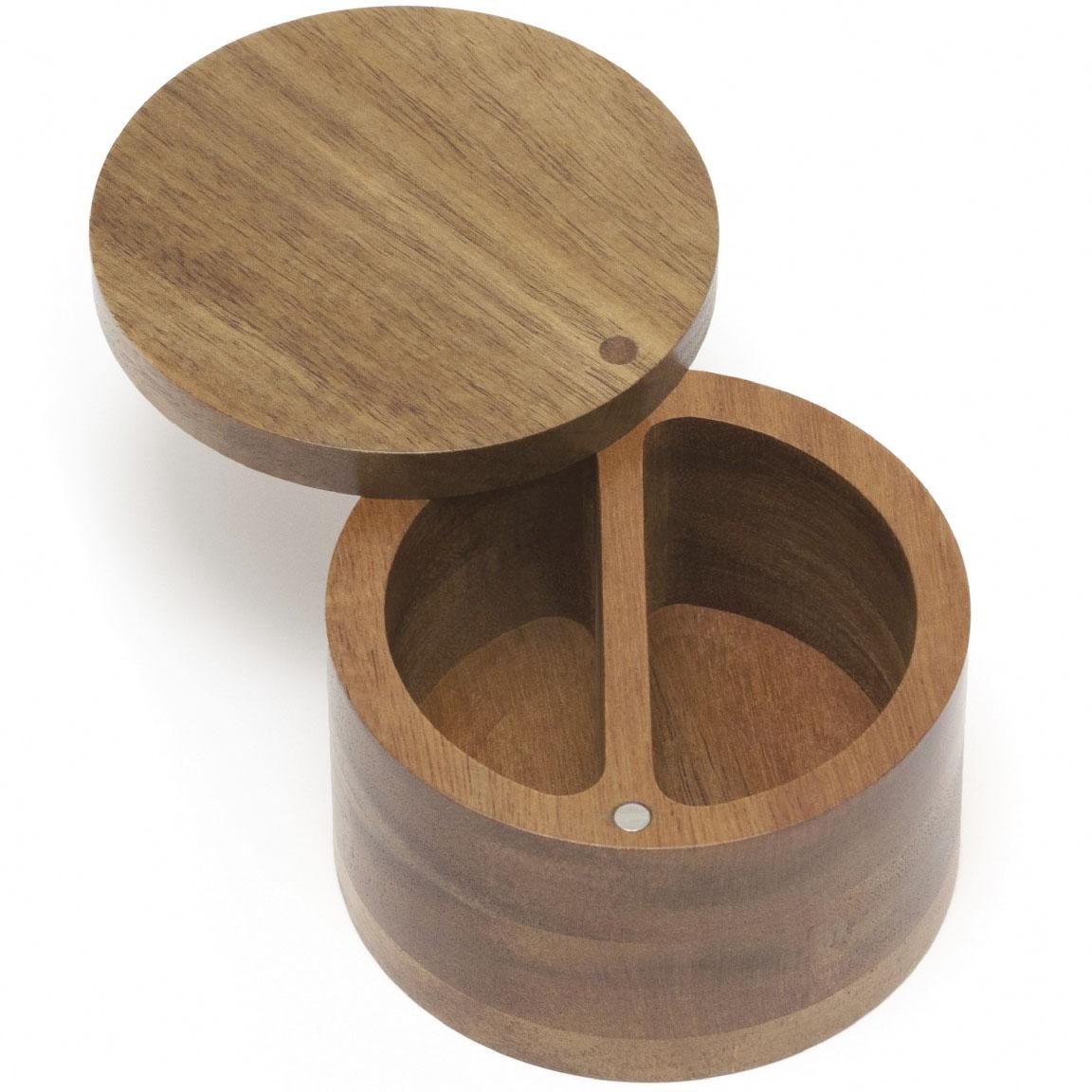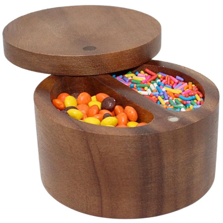 Made from durable and environmentally friendly acacia, this divided salt box features a swivel cover with a magnetic cover. Use it for salts, snacks and candy, or even for storing small household items. It measures 4" in diameter and 2.625" high.