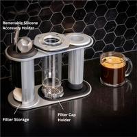 Keep your AeroPress coffee maker and accessories together and at your fingertips with this compact organizer stand. It saves counter space while elevating the look and feel of your kitchen’s coffee station and bar through premium materials and thoughtful craftsmanship. The AeroPress stand is made of food-grade stainless steel and silicone for a product that’s as beautiful as it is functional. 11” x 4” x 7.6” high.
