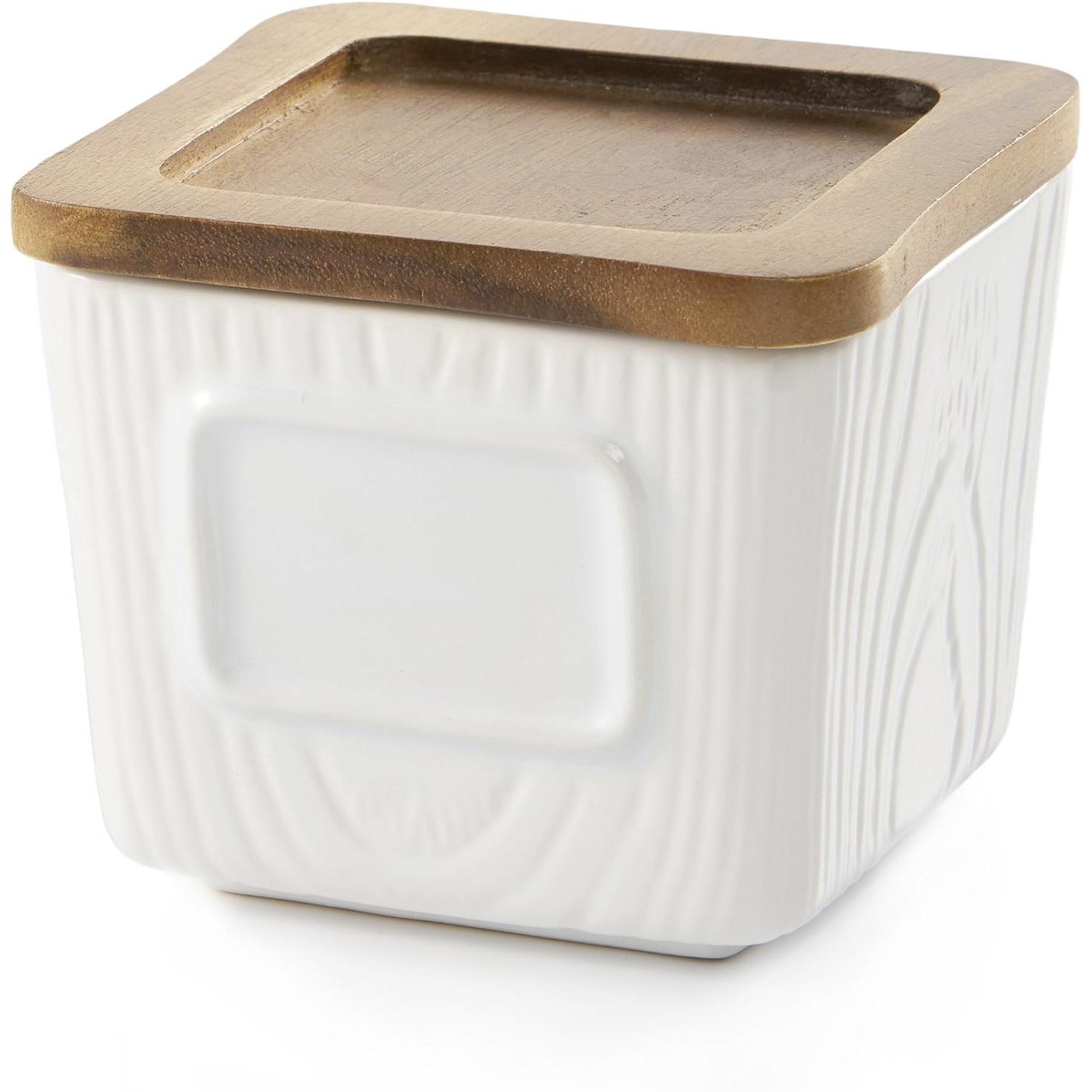 Made of rugged stoneware, this little canister is perfect for tea. It measures 3.5”-square and 3” high, and features a solid-acacia lid with an airtight silicone gasket to keep tea or other contents fresh. With a dry-erase marker (not included) you can note the contents on the flat space provided on the side of the canister. The stoneware body is dishwasher safe, the lid must be hand washed.