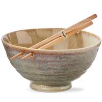 Complete with bamboo chopsticks, this stoneware noodle bowl features a reactive glaze that ensures that each example is unique in appearance. 6.5” in diameter, 3” tall, dishwasher and microwave safe.