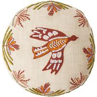 The circular, embroidered Andalusia pillow from artist Jessica Hiemstra features a variety of stitching techniques on a slub cotton background. 16” in diameter.