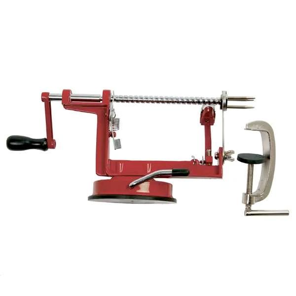If you bake apple pies or any other apple dessert, you'll love the Apple-Master. With it you can quickly and easily peel, core and slice apples, turning a tedious, aching-hand chore into a relatively quick and painless process. Simply anchor the Apple-Master in place on your counter with either the vacuum clamp or the "C" clamp, depending on the model. Then position an apple on the worm. Adjust the peeling and slicing blades, turn the crank and the apple is cored, peeled and sliced. Your apple slices will be of uniform thickness, essential for the best results when baking or dehydrating. The Apple-Master lets you just core and slice if you want to leave the peel on; you can also use it strictly as a peeler and it works well on potatoes and pears, too.