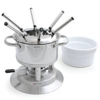 This beautiful stainless-steel multi-purpose fondue lets you make any type of fondue; meat, cheese or chocolate. For a meat fondue, bring cooking oil up to temperature on your stove in the stainless pot, then cook over the fondue burner at the table. Use the ceramic insert in the metal pot as a double boiler over water for melting delicate chocolate. Cheese fondue can be done in the stainless pot. The set includes the stainless pot, a spatter guard & rechaud, a white ceramic insert, six fondue forks and a fondue burner.