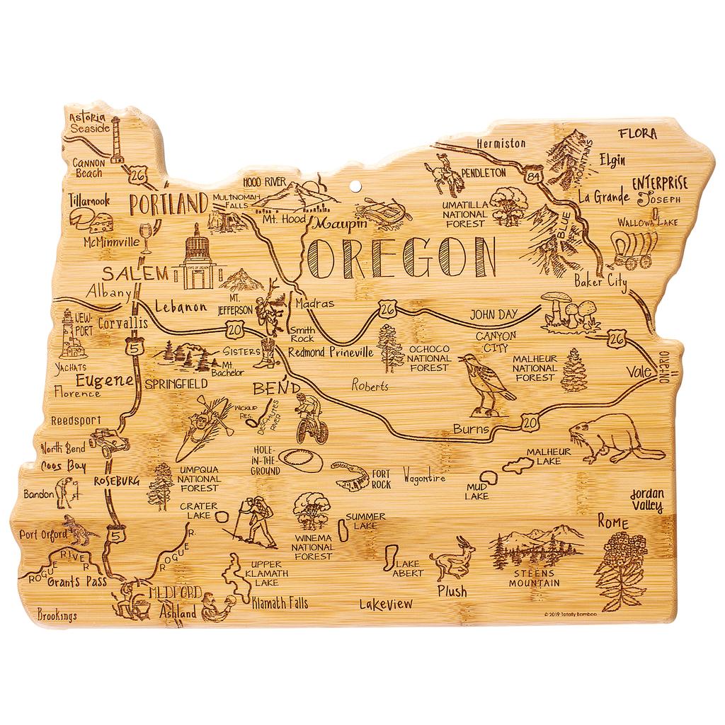 Howdy, Oregon! This bamboo board is laser-engraved with iconic points of interest, cities, historic landmarks and wonderful roadside attractions, reminding us of the places we love. Show off the decorative side, work on the plain side. Harder than maple, rapidly renewable, and beautiful to boot, bamboo makes an ideal material for cutting and serving boards. Bamboo boards clean easily by hand and are easy on your good knives. The Destination Oregon board measures 14.5" x 10.75".