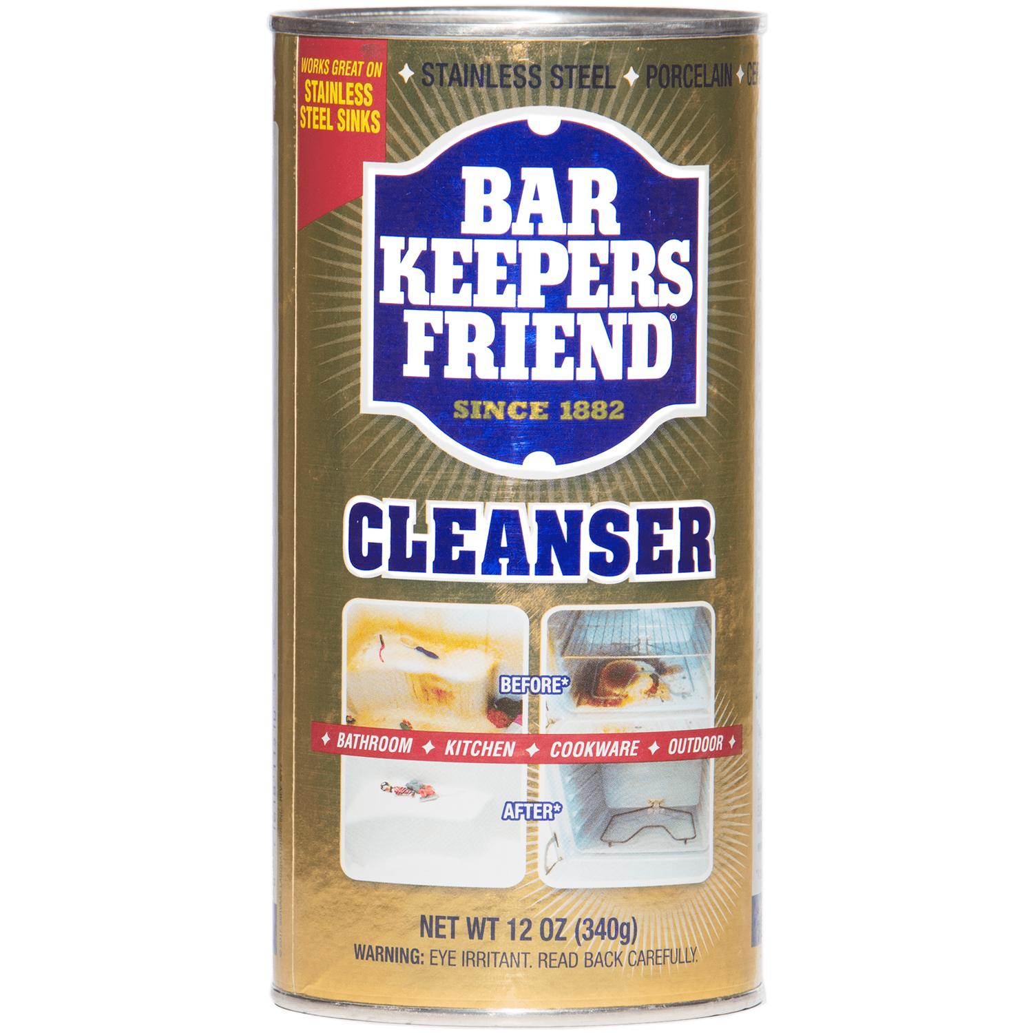 The original 1882 formula powdered cleanser still delivers premium cleaning power for stains on non-porous surfaces. Bar Keeper's Friend powdered cleanser restores shine to uncoated stainless steel and porcelain, cuts through tough grease, eliminates stubborn rust from surfaces, and removes tarnish, water spots, mineral deposits, and more. It's what you need to keep your stainless-steel cookware looking its best. 12-oz. can.
