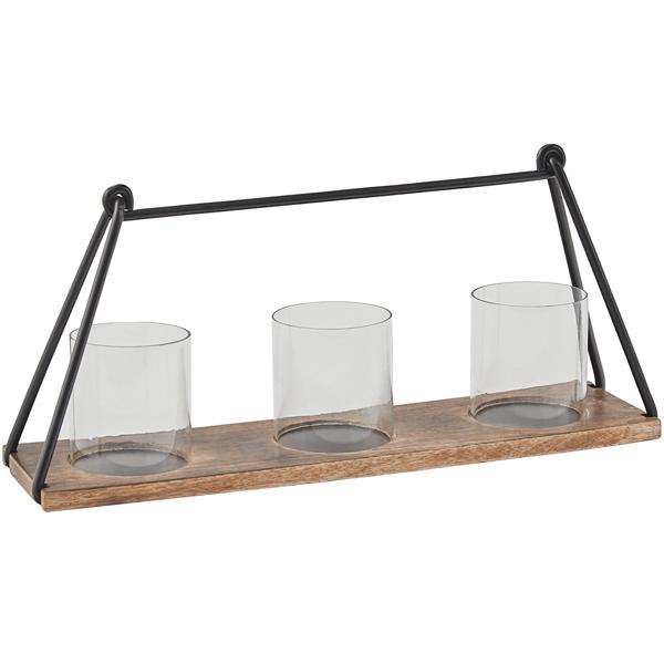 Made of wood and black-finished steel, this centerpiece candle holder accommodates three pillar or votive candles (not included) in the glass holders. It measures 15" wide, 7" high and 4" deep.