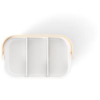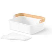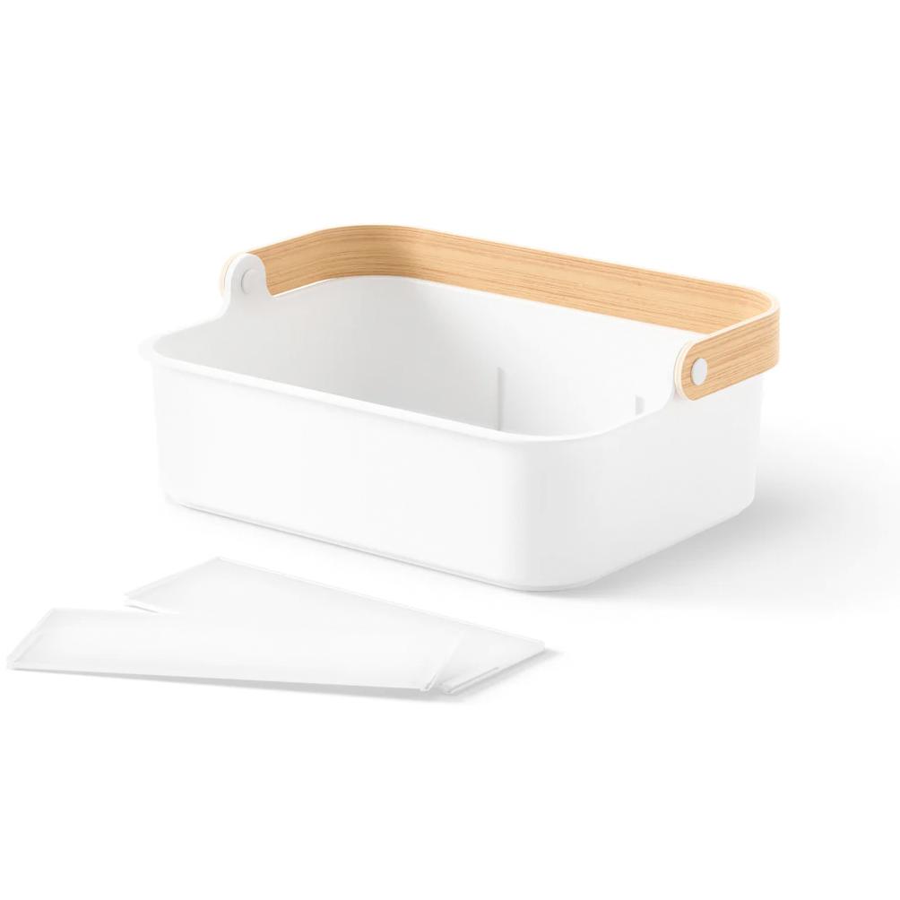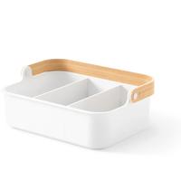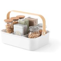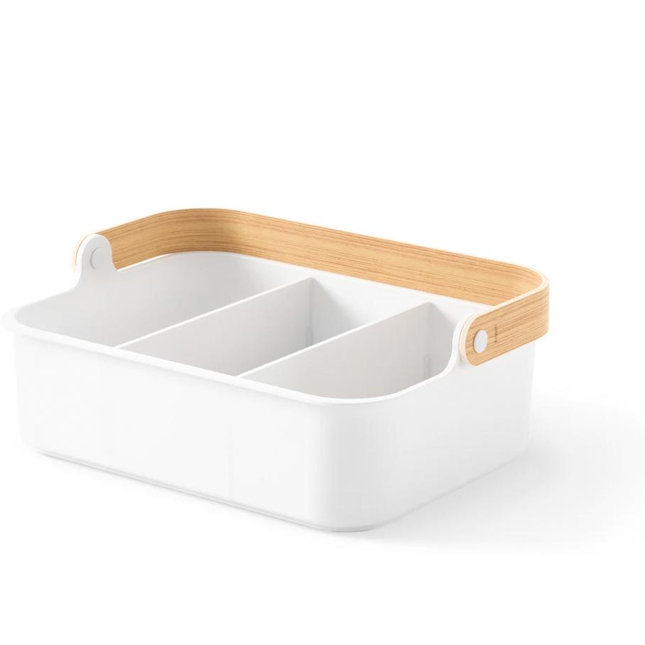 This versatile bin from Umbra is a great storage solution for most every room in the house. It's made from recycled plastic and wood with non-slip rubber feet, and features removable dividers for maximum utility, plus a handle that folds flat. Great in kitchen cupboards, in bathooms and craft spaces, and under the sink. It measure 10.84" x 6.5" x 5" high with handle folded down.