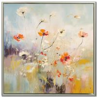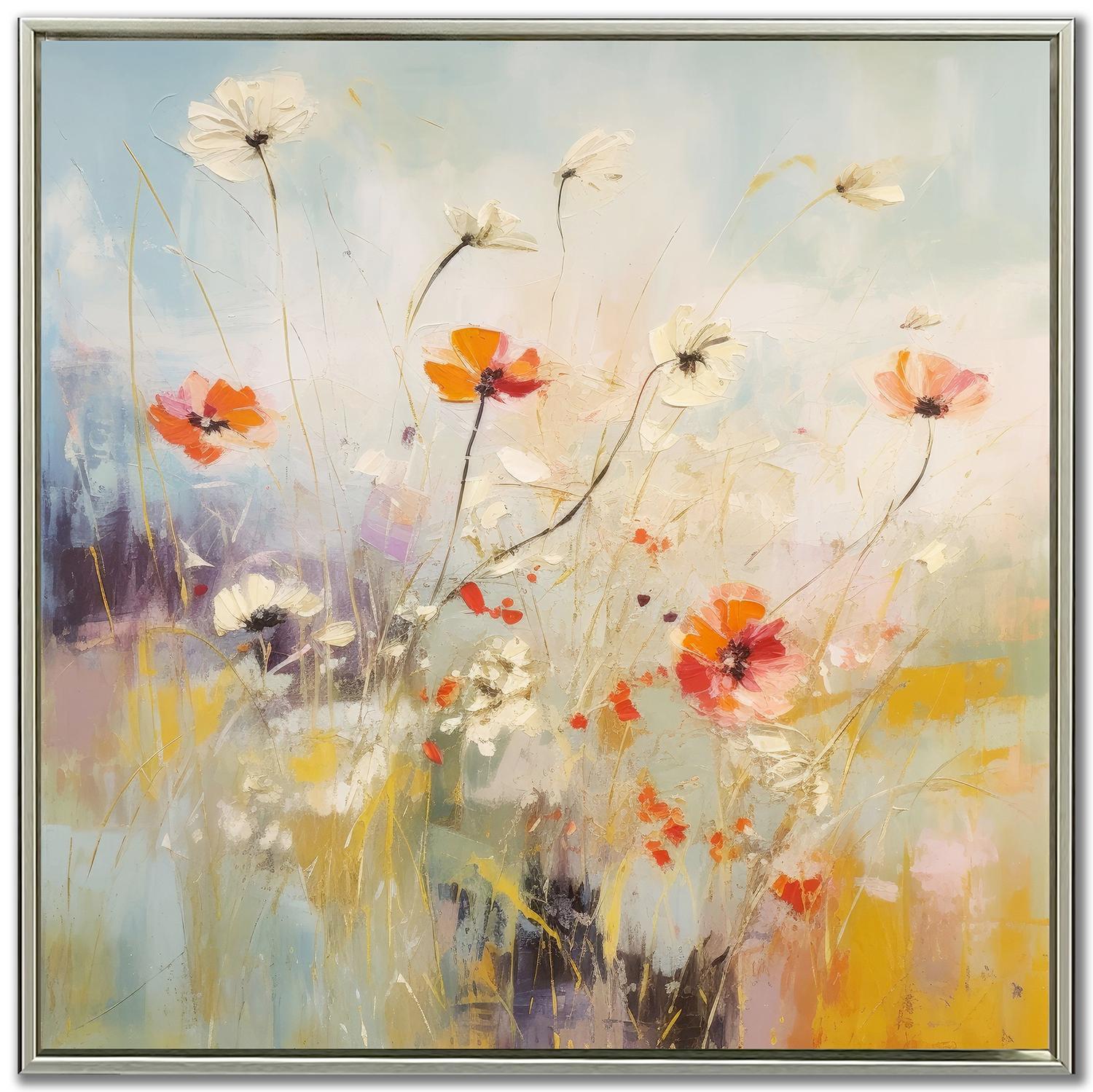 Hand embellished canvas art in a champagne floating frame, 24” x 24”.