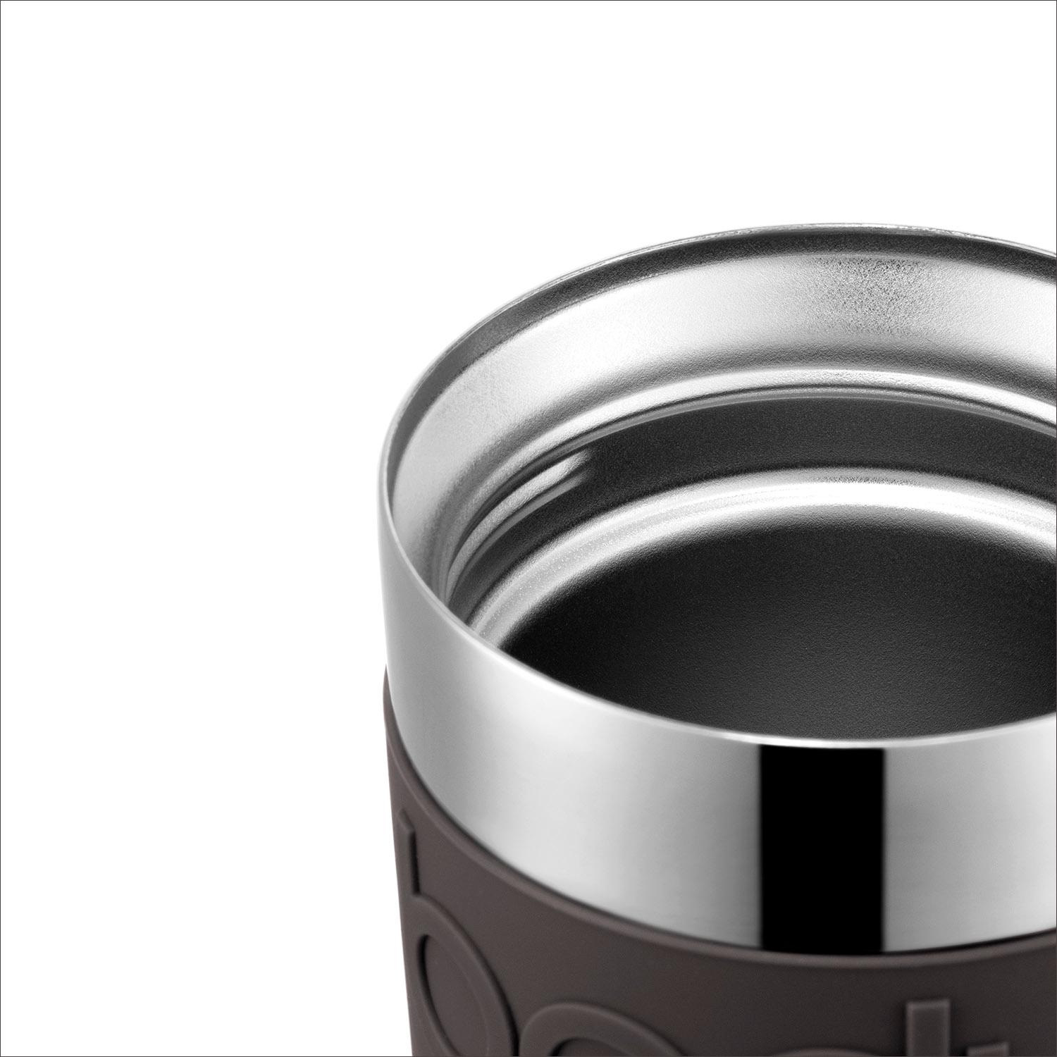 This mug from Bodum features a insulating double wall system that keeps both hot or cold beverages at their best. Made from two layers of stainless steel with an insulating air layer in between, this 12-oz. mug is wrapped a soft, non-slip silicone grip for comfort and security on the go. The double-wall insulation ensures that the outside stays cool to the touch no matter how hot the contents. Caution: make sure the Bodum travel mug stays upright when full. Due to safety reasons, the mug is not leakproof due to possible overpressure. Hand wash.