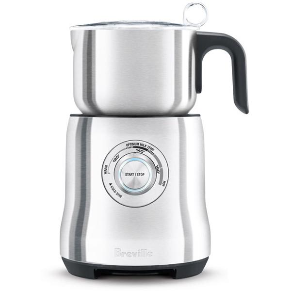 Breville has upped the ante in the milk frother competition. The stainless-steel Milk Cafe offers four temperature settings, Cold Froth (no heat), Warm (approx. 120F), Optimum Milk Temperature (approx. 140 F), and Hot (approx. 160 F), so different tastes can be accommodated. The stainless-steel milk container on top is heated by magnetic induction from the base, so the milk container simply detaches and goes in the dishwasher for clean up. You can choose from two frothing disks, the Latte disk for rich, creamy, tiny-bubble milk, and the Cappuccino disk that creates more froth. You simply choose your disk, add milk, select your desired temperature, and press the start button. The Milk Cafe spins the frothing disk for aeration and applies heat via magnetic induction. When your desired temperature is reached, the Milk Cafe shuts off automatically.