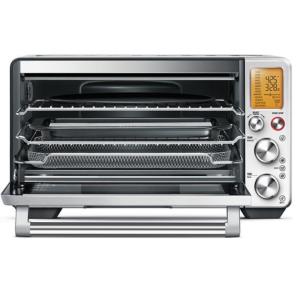 The Smart Oven Air features a one-cubic-foot capacity, large enough to roast a 14-lb. turkey, toast 9 slices of bread, and hold a 9" x 13" baking pan or a 12-cup muffin pan. 13 preset functions include toast, bagel, broil, bake, roast, warm, pizza, proof, air fry, reheat, cookies, slow cook and dehydrate. The Smart Oven Air comes with a 13" nonstick pizza pan, a 13" x 9" enamel baking pan, a stainless steel roasting rack, two heavy-duty oven racks, and an air-fry/dehydrate mesh basket. 21" x 17" x 12". 2-year limited warranty.
