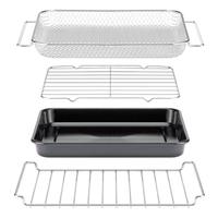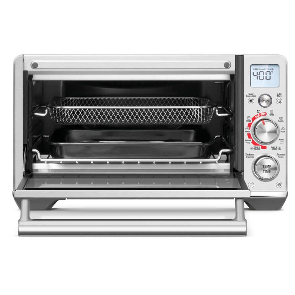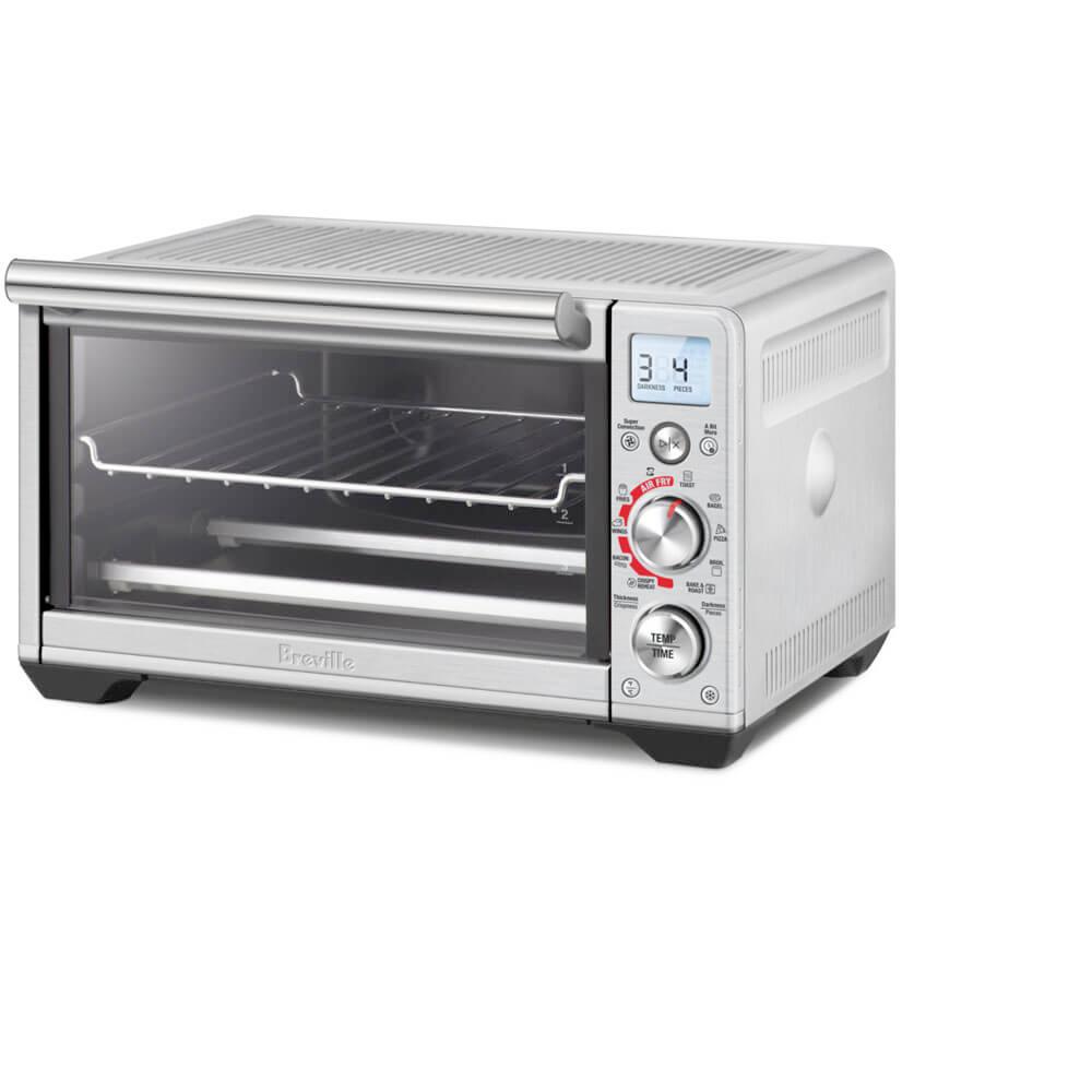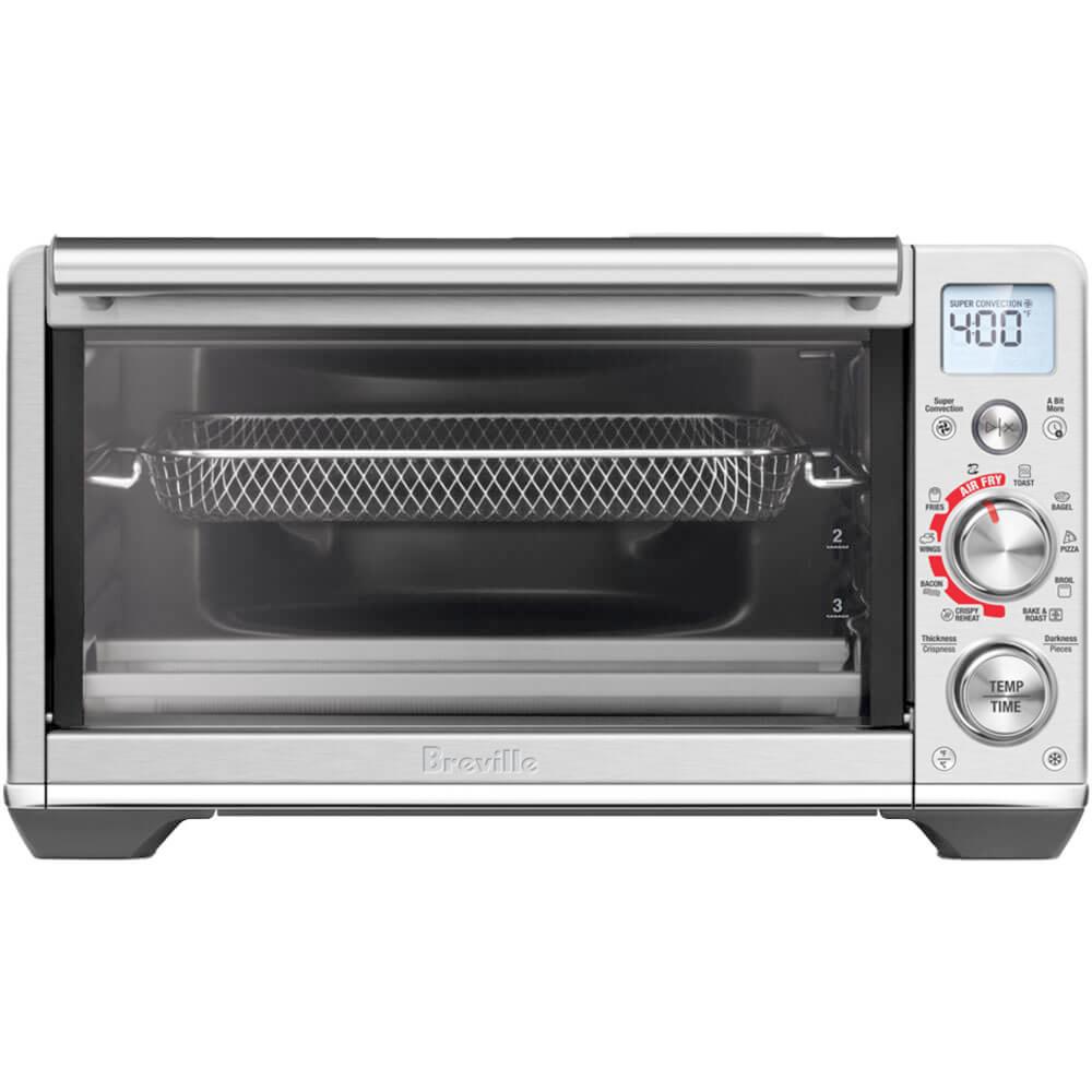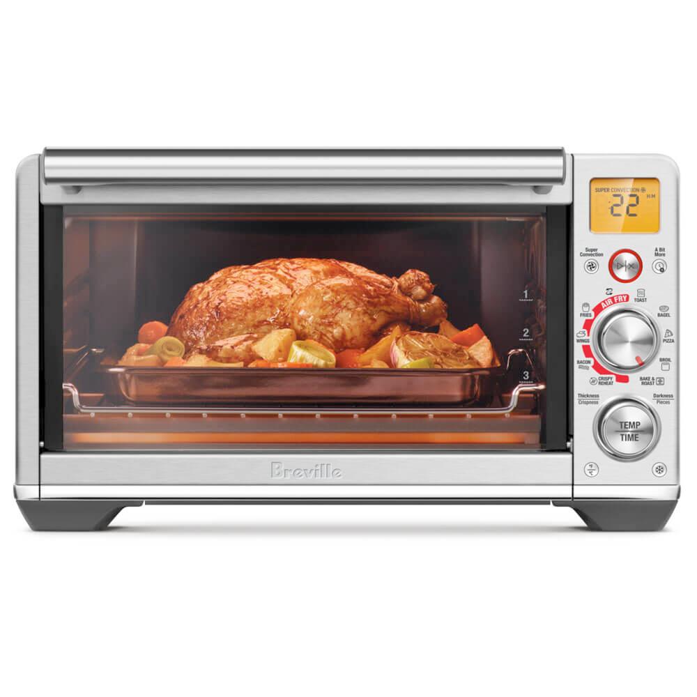 The Breville Smart Oven Air Fryer Compact features a 0.5 cubic foot capacity and comes with a broiling rack, a roasting pan, an air fryer basket, and a reversible oven rack. The Breville+ app is free to download for iOS and Android devices when you register your oven and features an ecosystem of guided recipes, live and on-demand classes, cooking guides and more, with step-by-step guidance on 200+ recipes, all tested and tuned to your oven. 2-year limited manufacturer's warranty.