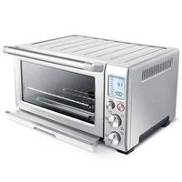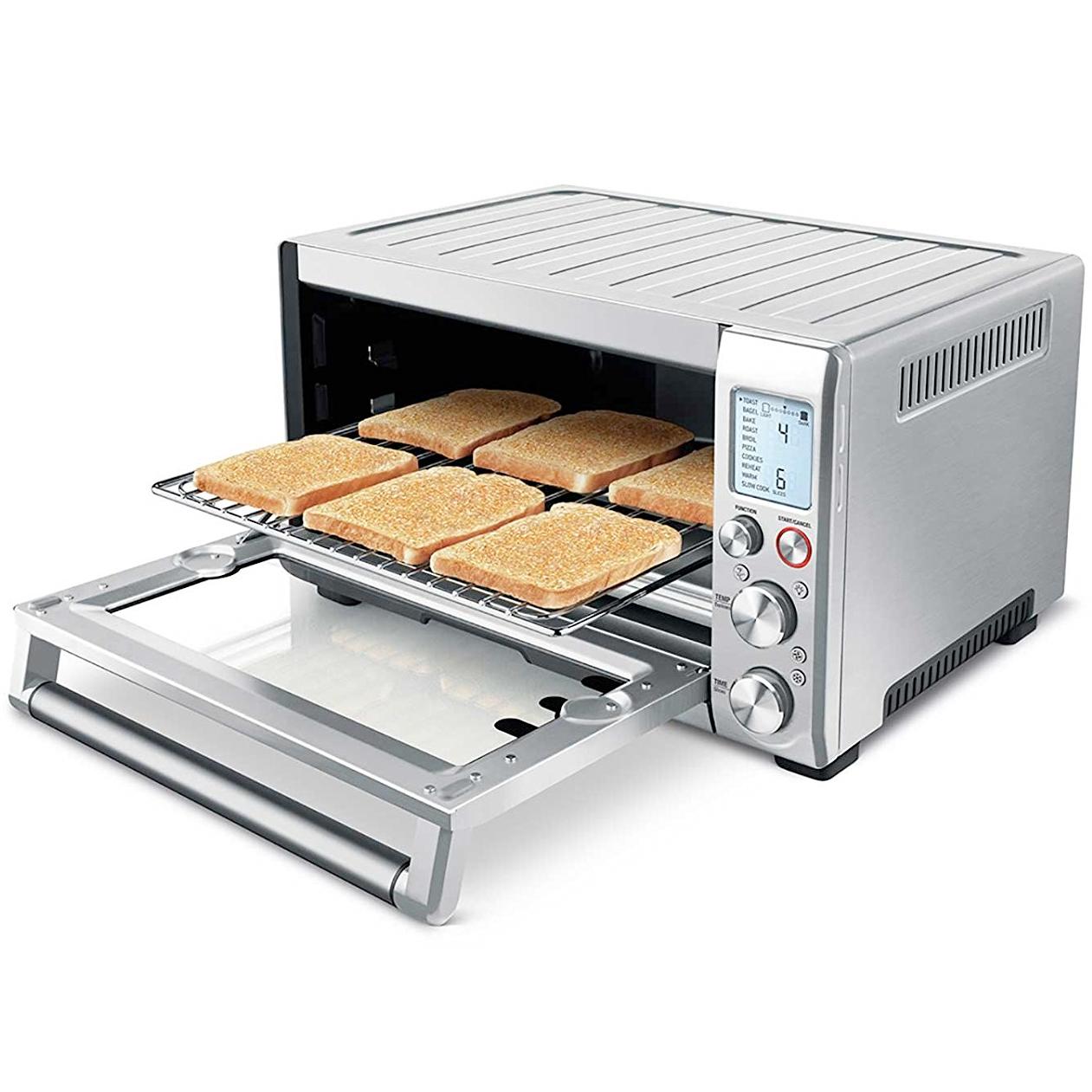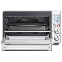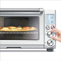 This Breville stainless-steel countertop convection oven has a host of useful features. It features five independent quartz heating elements that are monitored and controlled by what Breville calls Element IQ to put the heat where it's needed for uniform temperature throughout the cooking chamber. It will do more of the thinking for you with ten pre-programmed cooking cycles from Toast to Roast to Pizza to Cookies that automatically select cooking times and temperatures. There's even a slow-cook setting for cooking at low temperatures for long periods, up to ten hours, that automatically switches to a "keep warm" setting, so food is ready when you are. And with the convection feature circulating hot air, cooking times are reduced by up to 30%. The 0.8 cubic foot, non-stick interior will accommodate most Dutch ovens up to 3.5 qts. with the lid on, and most 5-qt. pots with a foil cover. To get the most out of your oven, it comes with an 12" x 12" enamel baking pan, a 12" x 12" enamel broiler pan and a 13"-dia. non-stick pizza pan. The overall exterior dimensions of the Smart Oven Pro are 18.5" wide, 14.5" deep and 11" high.