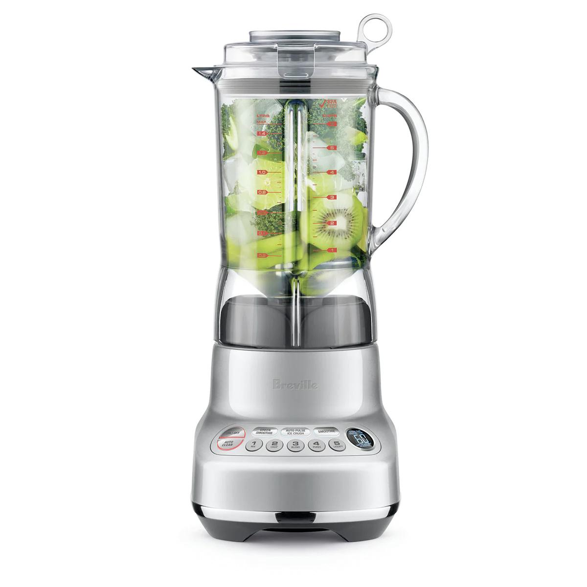 Breville's has updated their best-selling blender with more power, and a new blade system dubbed Kinetix that delivers unsurpassed blending quality and efficiency. They've also given the new blender a - let's say, memorable - name. The Kinetix blade and bowl system pulverizes virtually any combination of ingredients and creates particles that are up to 50% smaller than those produced during traditional blending. The Kinetix system ensures that there are no dead zones where ingredients can hide and escape being blended. Inside the die-cast metal base, a 1000-watt motor provides plenty of power, while five push-button-controlled speed settings - Mix, Chop. Blend, Puree, and Liquify - give you the control you need:. Plus, there are one-touch buttons for pre-set smoothie, green smoothie and crushed-ice programs; these programs automatically vary the speed and duration of blending for optimum results with minimal effort. Of course, there's a manual pulse button, too. The control panel of the Hemisphere blender, with its back-lit pushbuttons and digital timer LCD screen, is crevice-free and easy to wipe clean. The dishwasher-safe blending jar is made of lightweight, BPA-free, nearly-unbreakable Eastman Tritan, and has a capacity of 48 ozs. The lid includes a measuring cap for adding ingredients. 6.5" x 8" x 17.5" tall. 3-year limited warranty.