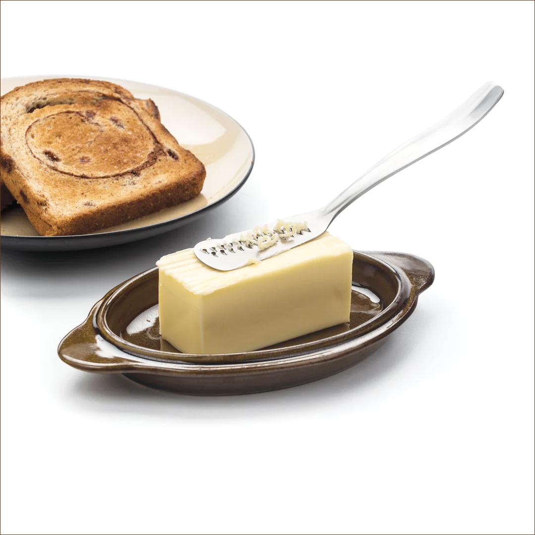 Don't despair when you only have cold butter, and you've just made toast. This ingenious knife shaves small curls of cold butter on one side; the other side is smooth, so you easily spread the little curls. No more ripped up toast! Made from dishwasher-safe stainless steel, 7" long.