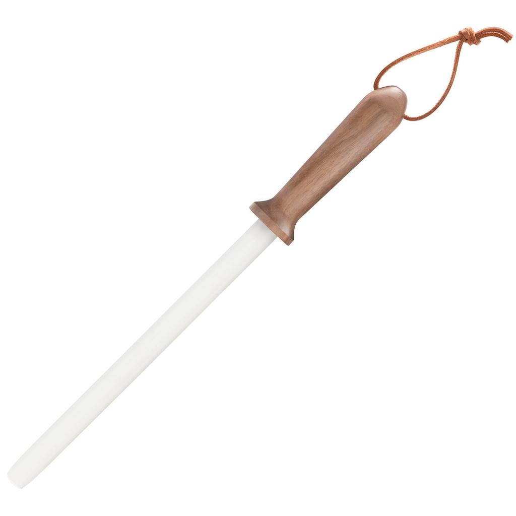 Keep your good knives in tip-top shape using a honing steel. A steel doesn't sharpen your knife, but it keeps the edge aligned for prolonged sharpness, and lets you put off actual sharpening, which removes metal from the blade and shortens knife life. This Cangshan ceramic honing rod is harder and more abrasive than a steel rod, and is better suited to restoring, aligning and refining the edge on modern, hard-steel knives like those from Shun. The hardwood handle provides a comfortable and secure grip, with a leather hanging loop at the end. With the proper, easy-to-learn technique maintaining a knife edge takes just seconds.