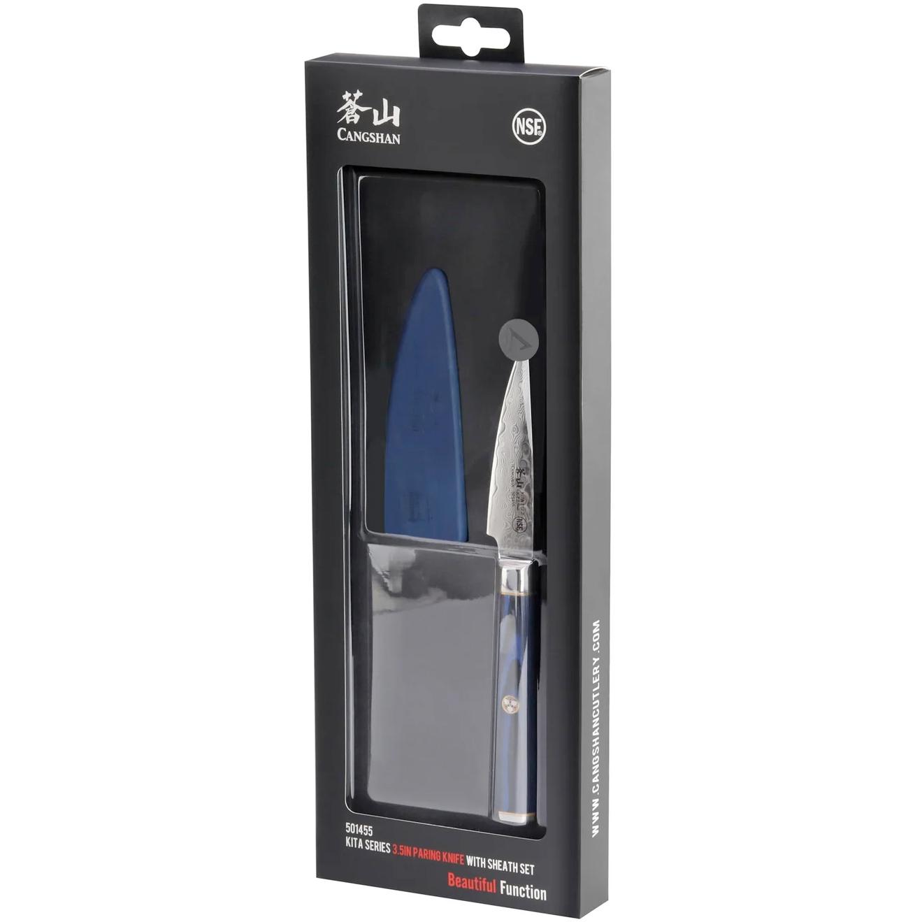 Kita knives from Cangshan are dramatic in appearance, superior in performance and a terrific value. Cangshan’s X-7 steel is formulated to be harder than German steel, as hard as Japanese VG-10 steel, but not as brittle as the latter. Layers of this X-7 steel are folded 67 times to create the “hammered” appearance and texture that minimizes food sticking to the blade when cutting. This “Damascus” process also results in beautiful knives, especially the Kita series, with the fiberglass octagonal sapphire-blue-and-black handles that are mated to the full tang blades and are enhanced by a single medallion rivet. Kita blades are hand-sharpened to a precise 16° angle and have a Rockwell hardness rating of 60 +/-2.
