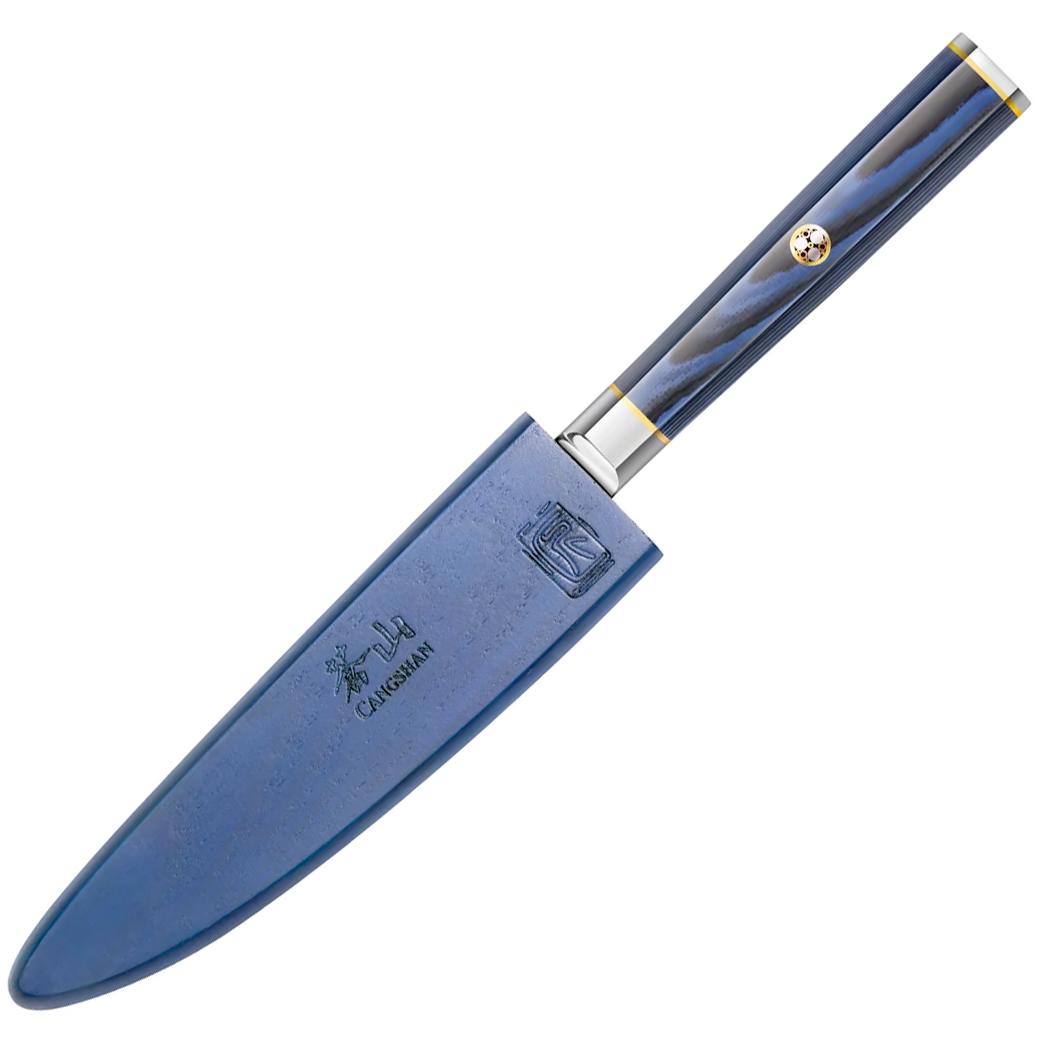 Kita knives from Cangshan are dramatic in appearance, superior in performance and a terrific value. Cangshan’s X-7 steel is formulated to be harder than German steel, as hard as Japanese VG-10 steel, but not as brittle as the latter. Layers of this X-7 steel are folded 67 times to create the “hammered” appearance and texture that minimizes food sticking to the blade when cutting. This “Damascus” process also results in beautiful knives, especially the Kita series, with the fiberglass octagonal sapphire-blue-and-black handles that are mated to the full tang blades and are enhanced by a single medallion rivet. Kita blades are hand-sharpened to a precise 16° angle and have a Rockwell hardness rating of 60 +/-2.