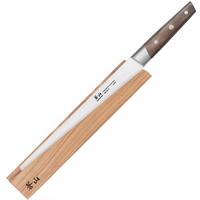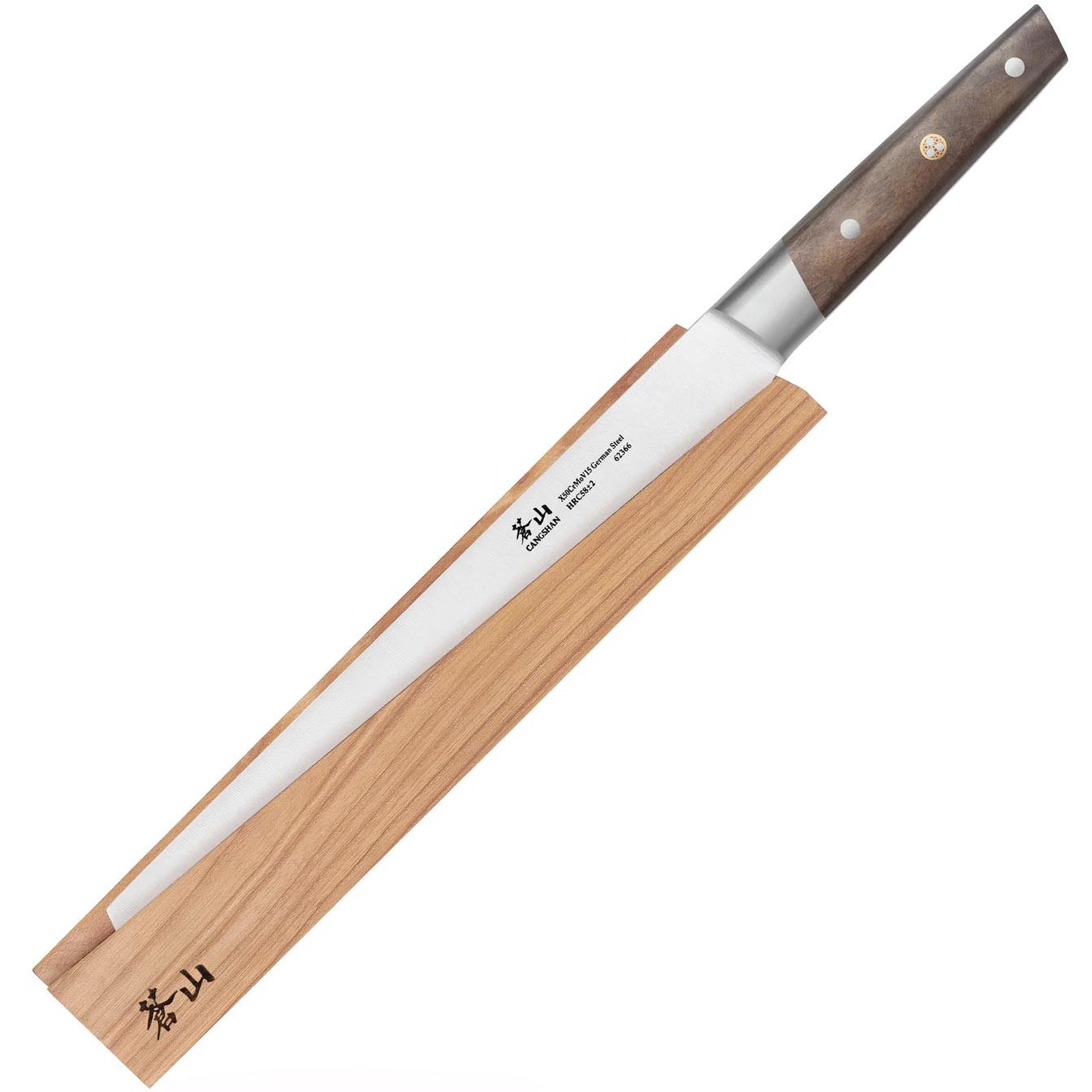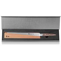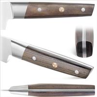 This scalloped bread knife is forged from tight-grained, X50CrMoV15 German steel measuring HRC 58 +/- 2 on the Rockwell hardness scale, for incredible durability, stain resistance, and exceptional edge retention. It gives you smooth, clean, and precise cuts whether you're slicing bread, roasted meat, or delicate-skinned fruits and vegetables. The full tang extends into the beautiful handle which features a distinctive mosaic rivet. The knife comes with a carbonized, solid-ash, half-open magnetic sheath with three embedded magnets which hold the sheath tight to the spine of the knife. The R Series bread knife is NSF International certified, with a lifetime warranty from Cangshan against manufacturer defects.