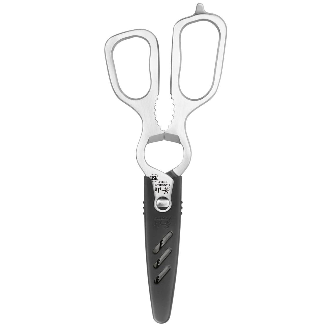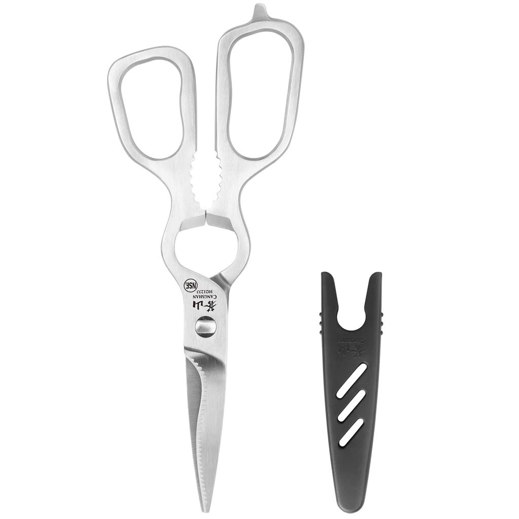 A truly excellent pair of shears that are forged from tempered, German, high-carbon 3CR13 stainless steel for exceptional strength. They're excellent for everything from taking apart a whole chicken to harvesting herbs to cracking nuts and opening bottles. The "D"-shaped handles are a patented design that improve and comfort and safety, and the blades easily come apart for thorough cleaning. Protective blade guard included, hand washing recommended.