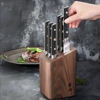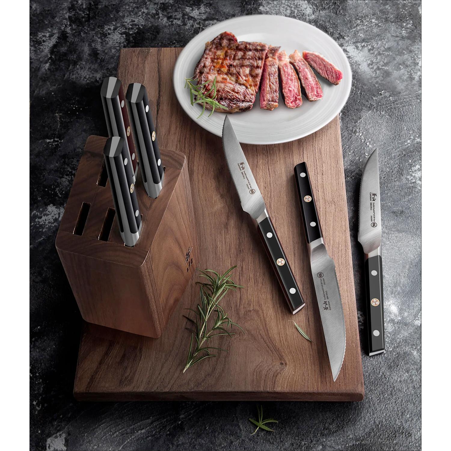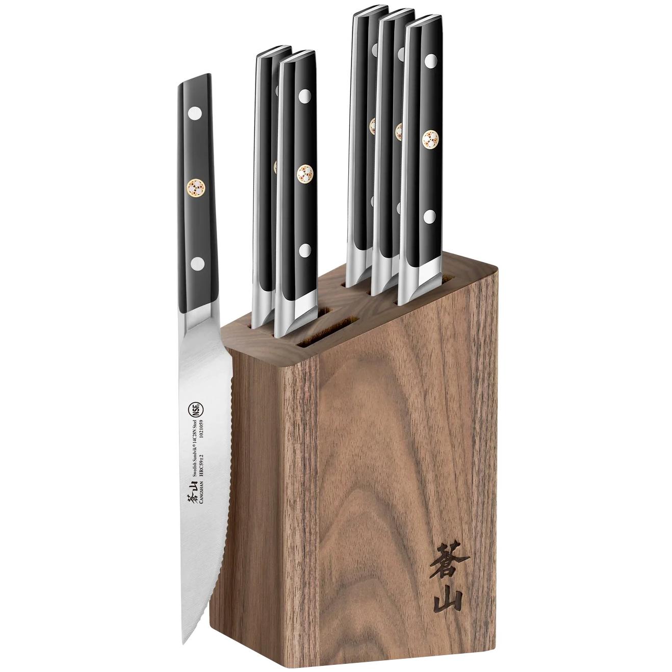TC Series knives from Cangshan are full-tang knives fully forged from Swedish 14C28N steel, an alloy that measures 59 +/- 2 on the Rockwell Hardness Scale. The steel offers exceptional sharpness and holds an edge up to 5 times longer than German X50Cr15MoV steel. The patent-pending design of TC series cutlery focuses on the uniquely tapered tang, which makes each knife comfortable and perfect for precise cutting. Each TC Series knife comes with a carbonized solid-ash, half-open magnetic sheath. TC Series knives are NSF certified for commercial use and carry a lifetime manufacturer's warranty against defects in materials and workmanship. This beautiful set features a sleek, modern, solid-hardwood block that safely and stylishly stores the serrated-edge knives.