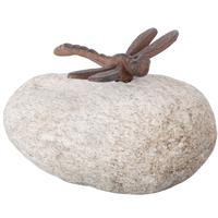 This hand-cast iron dragonfly is resting on a stone that measures approx. 5” in length. Fun for decorating indoors or out.