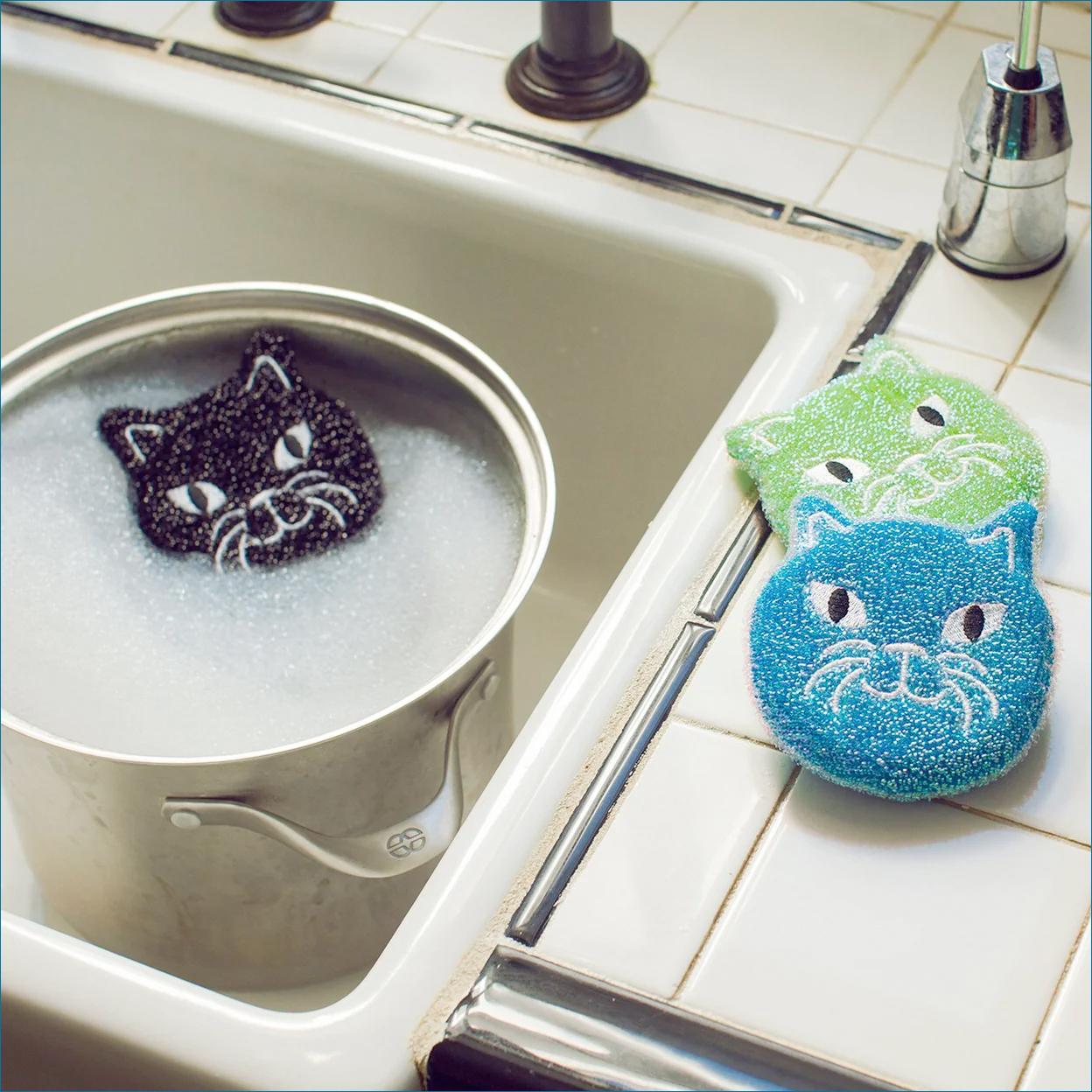 These cats love water. Each kitty features a polyurethane sponge with a nylon scrubbing surface, and is perfect for cleaning dishes, counters and other smooth surfaces. Just wash in warm soapy water to clean.
