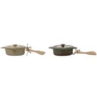 This charming little baking dish is made of durable stoneware that’s oven, microwave and dishwasher safe. It features a de-bossed lid and a wood spreader and measures 7” in diameter and 3.5” high. Choose from two colors, each featuring a reactive glaze that ensures that each example is unique in appearance. These brie bakers are riced and sold individually; please specify your color choices in the Order Notes field in your shopping cart.