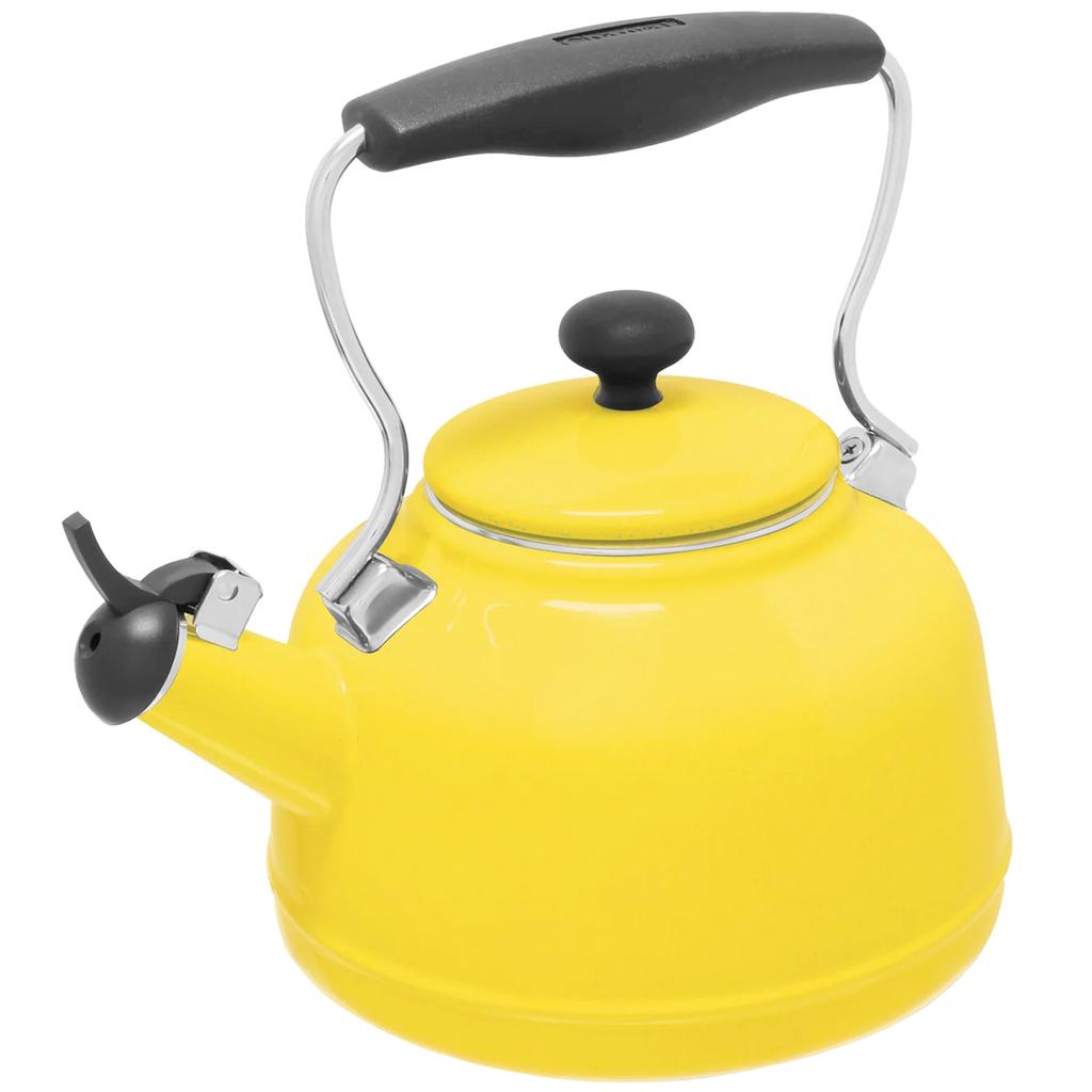 Chantal's aptly named Vintage kettle features retro styling along with modern features. The kettle body is made in one piece of carbon steel; it heats quickly on any stovetop, including magnetic induction. High-quality enamel covers both the exterior and the interior to stand up to calcium and mineral deposits. The handle and the knob on the lid are made of stay-cool material, and when the water boils it activates a compelling whistle. 1.7-qt. capacity.