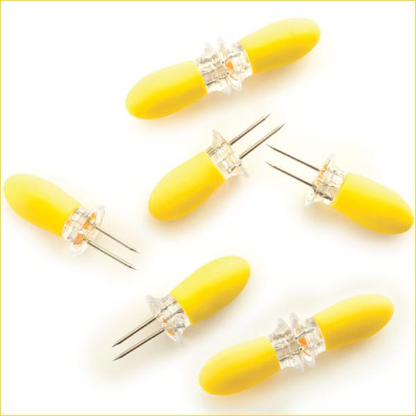 Keep the heat and butter off your fingers with these corn holders. The stainless-steel prongs pierce the cob for stability, and interlock for safe storage. 3" long, dishwasher safe. This is a set of six holders to grab three ears or corn.
