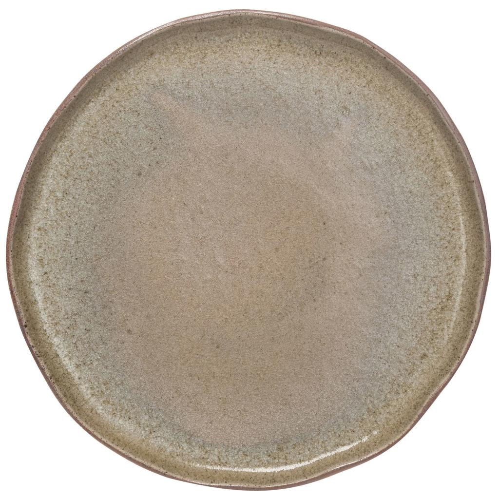 Featuring an "organic" shape, a raised rim and a reactive, crackle glaze, each example of this 11"-diameter plate will be unique in appearance. Made of rugged stoneware, the plate is safe in the microwave and dishwasher.