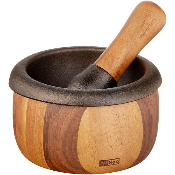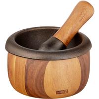 The beautiful Crush mortar & pestle set is made of acacia wood, with cast-iron grinding surfaces on both the mortar and the pestle. The pestle is fat and comfy in the hand and the textured cast-iron aids in rapid pulverising of spices, herbs, garlic, and a whole lot more. Just over 5" in diameter. Hand wash only and allow to dry thoroughly before storing.