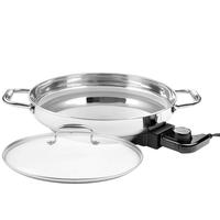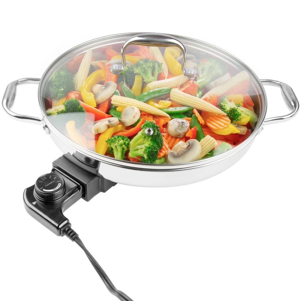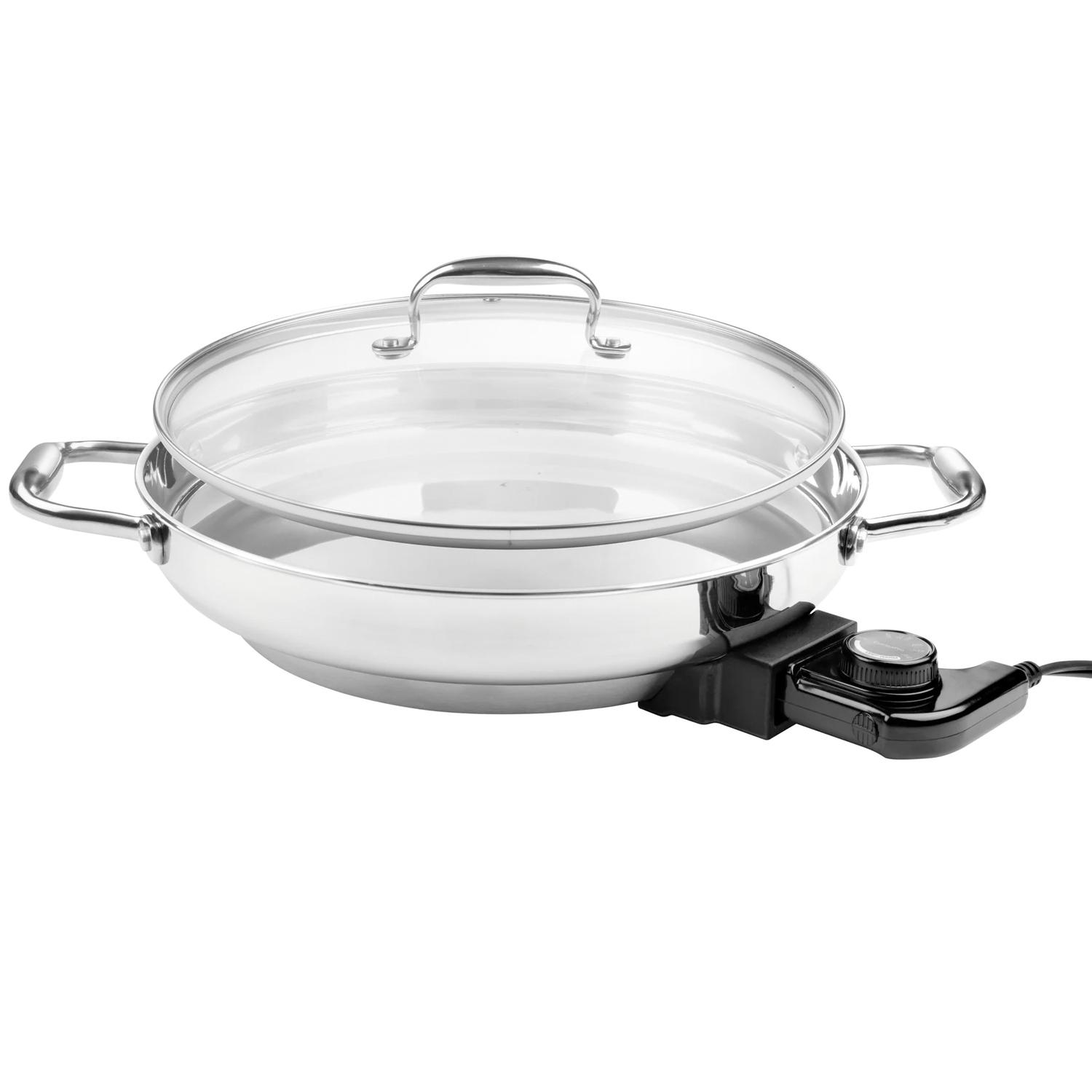 Give yourself a countertop cooking option, or a great buffet server, with this 16"-diameter electric skillet. The highly polished, 18/8 skillet is large enough to cook for four, and features a detachable temperature probe that gives you precise heat control, anywhere from "keep warm" to 400° F. The tempered-glass lid helps retain heat, and lets you see what's cooking, so you can achieve perfect simmers. Sturdy, riveted handles make handling easy. The temperature probe easily detaches - just pull it out - so the skillet can be hand washed.