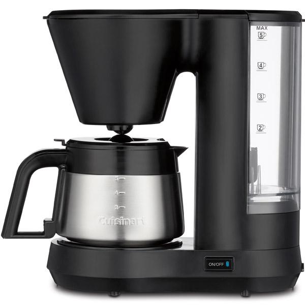 Simple and easy are the watchwords for Cuisinart's 5- cup coffeemaker. An on/off switch gets the brewing started. A brew-pause feature stops the dripping if you want to grab a quick cup. And an auto-shut-off, 30-minute warming plate keeps coffee hot after brewing. The filter is a permanent nylon one; you can use paper filters if you like, the water tank is removable for easy filling, and the whole thing takes up very little counter space, measuring just 5.67" wide x 10.14" deep x 10.85" high. A charcoal water filter is included and you get a 3-year unlimited warranty from Cuisinart.