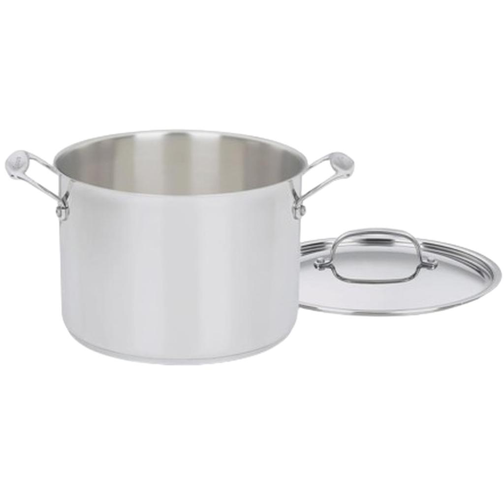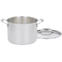 Need an outstanding stockpot at an outstanding price? Then this Chef's Classic stockpot from Cuisinart is for you. It's made of gleaming, polished stainless steel with a thick disc of aluminum encapsulated in the bottom. This combination gives you the durability and good looks of stainless steel along with the rapid and uniform heat conduction properties of aluminum. The Chef's Classic stockpot performs beautifully on all types of stovetops, including magnetic induction, is safe in the dishwasher, has measurement markings on the interior wall, and comes with a tempered-glass lid that makes it easy to check on a simmer. The riveted handles minimize heat transfer for easier handling. Lifetime warranty from Cuisinart.