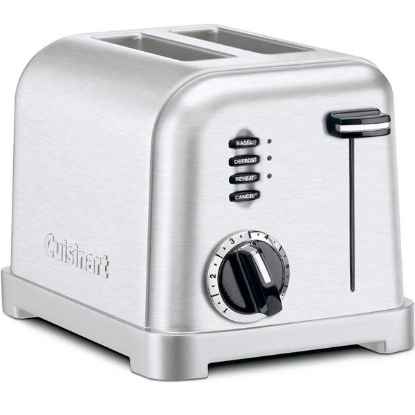 Cuisinart's very cool looking, brushed-stainless toaster offesr consistent toasting and a wealth of features, at a great low price. You get 1.5"-wide slots for the thickest bread, bagels and toaster pastries; 6-position browning control; reheat, defrost and bagel (toasts one side only) buttons; and an extra-lift lever for easy toast removal. There's also a slide-out crumb tray and a cord wrap on the underside. Simple, reliable and affordable; it's no wonder that this toaster has been a favorite for years.3-year limited warranty. 10.8" deep x 7.1" wide x &.7.1" high.