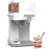With this Cuisinart ice cream maker, you can turn out fresh soft serve ice cream with toppings, mix-ins and more, in just minutes. Not only soft-serve ice cream, but yogurt, sorbet, sherbet, and frozen drinks are easy to make in just 30 minutes - with no chemicals, salt, or ice required, thanks to the 1.5-qt. double-insulated freezer bowl. With 3 condiment containers and a 4-oz. keep-warm cup and heating plate, you can add your favorite mix-ins into your soft serve ice cream as it’s dispensed, or pour warm liquid toppings to finish off your frosty treat. Yum! Simply pull out one, two or three of the levers to add the mix-ins of your choice, then pull down the handle to dispense the soft serve ice cream directly into cones or bowls with an ice cream swirl like an authentic soft-serve machine. There's even a fold-out cone holder to hold a supply of ice cream cones. The Mix-It-In ice cream maker measures 11" x 9.4" x 17.7" high and features a 3-year limited manufacturer's warranty.