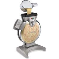 This clever, space-saving design from Cuisinart bakes a 1"-deep, round Belgiian waffle, ready to be cut into four servings. The vertical design, in brushed stainless steel, takes up litte counter space and ensures that your batter completely and evenly fills the non-stick baking plates. An included measuring cup makes it easy to add just the right amount of batter through the handy top-mounted filling spout. Your waffles can be baked to any of five levels of browness with a rotary dial, and there's an audible alert, along with a green light indicator, to tell when your waffles are ready. A red light indicates that baking is in progress. 13" wide, 8" deep, 15" tall; manufacturer's limited 3-year warranty.