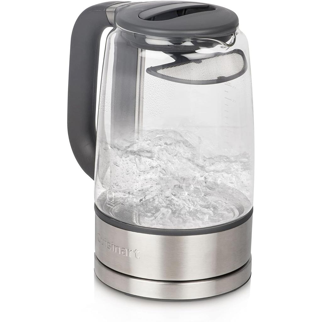 Fast, energy-efficient and safe, Cuisinart's ViewPro kettle brings up to 1.7 liters of water to a boil in just minutes, thanks to the 1,500-watt heating element. The clear glass carafe lets you keep an eye on how the water is doing and the kettle's automatic shut off with overheat and boil-dry protection eliminates any worries. The power cord attaches to the base, so the kettle itself swivels and lifts off the base for cord-free transport and pouring. A simple one-touch on/off control with blue LED indicators makes the ViewPro easy to use, while the stay-cool handle makes it a breeze to pour. Easy-to-read water level markings are there for convenience, and inside is a removable and cleanable scale filter. The ViewPro kettle measures 10" x 7" x 12" high and is backed by a 3-year limited warranty from Cuisinart.