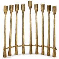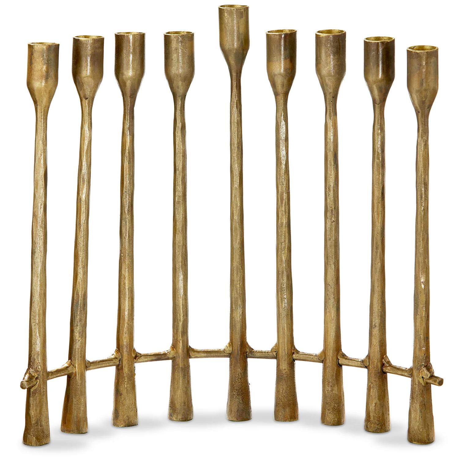 This striking menorah is made of antique-bronze-finished iron and measures 10.5” wide and 9.5” high.