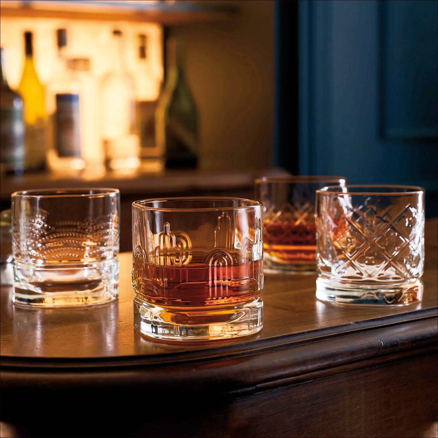 Beautiful, elegant, refined, these French-made glasses enhance the pleasures of fine whiskey with four patterns, symbolic of the whiskey-making countries of Scotland, Ireland, Japan, and the United States. These patterns, created by the La Racine design studio, are molded into the heavy, pressed glass, creating light effects that play on the colors of the spirit. The Dandy whiskey glasss are made in a distinctive "square" shape, with rounded corners and heavy bases. They come boxed for easy giving. Each glass measures 3.25" in diameter, 3.5" high and has a capacity of 10 ozs. Dishwasher safe.
