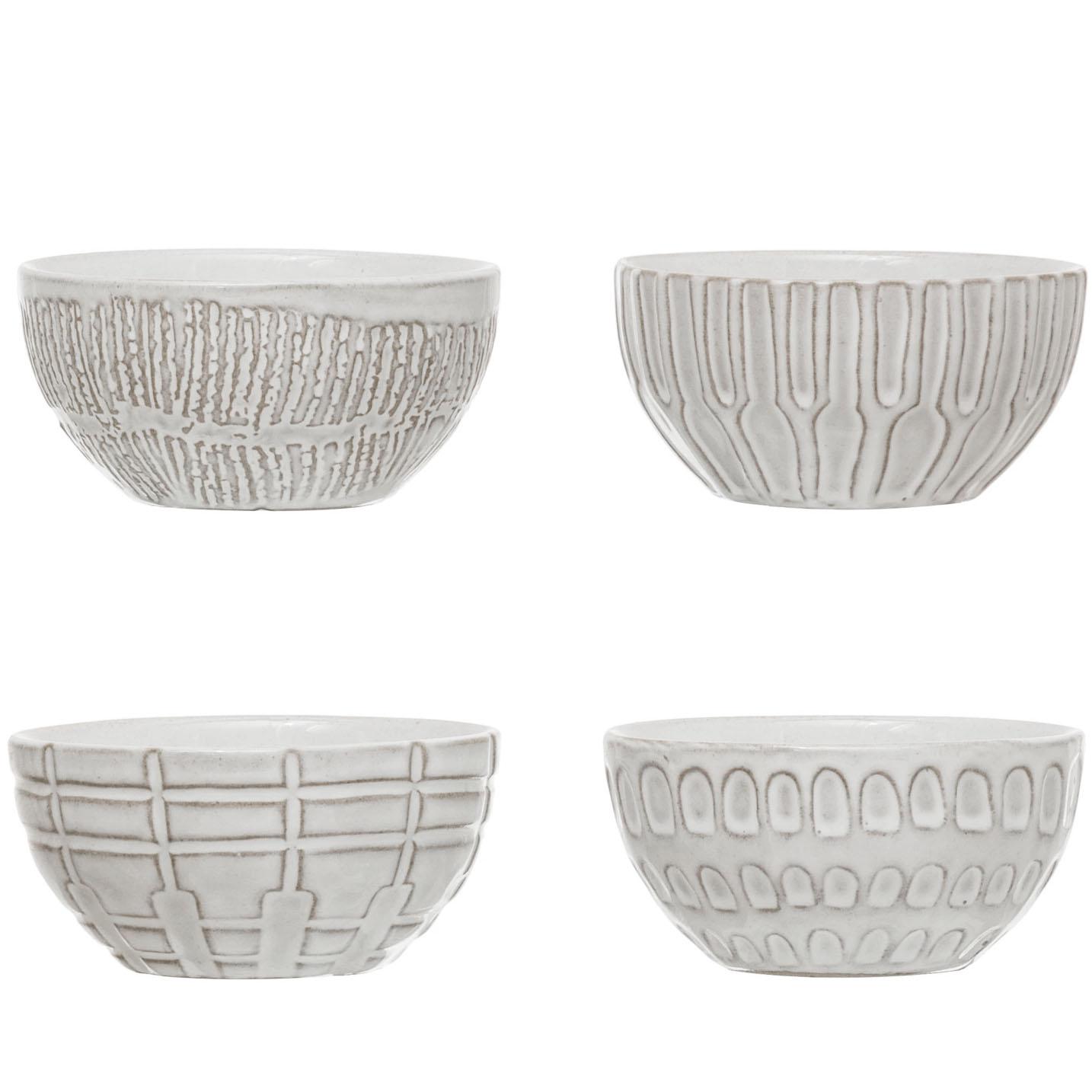 Each of these rugged stoneware bowls features a debossed design and a reactive glaze that makes each example unique in appearance. The bowls measure 4" in diameter and 3" tall and are perfect for everything from soup and cereal to dips and sauces. Choose from four styles, priced and sold individually. Please specify your choices in the Order Notes field in your shopping cart.