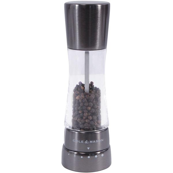 The stainless-steel verion of the Derwent mill is top-rated by Cook's Illustrated. This gunmetal and acrylic Derwent pepper mill is, other than the finish identical, with a precise, hardened carbon steel grinding mechanism that adjusts to five pre-set grinds by simply rotating the bottom ring. To refill, you just lift off the top. 7.5" tall.