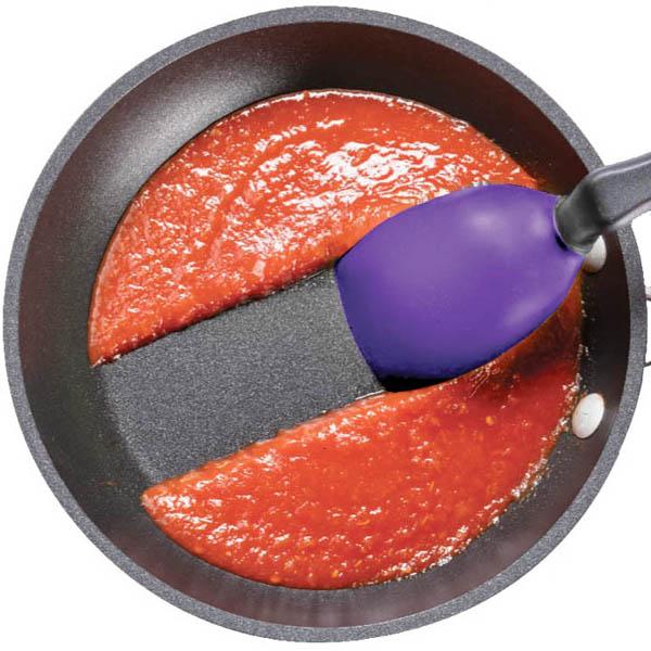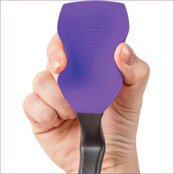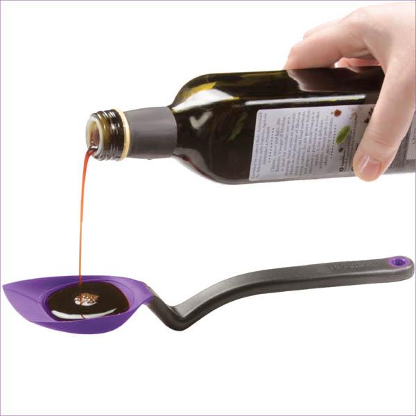 It just may be the finest cooking spoon in the world, the silicone Supoon (like a SUper sPOON) from Dreamfarm. The Supoon scrapes, scoops, and measures, plus sits up flat on the counter, to boot. Good spoon! The deep head is made from high-grade, flexible, non-stick silicone that's safe to 500 degrees F. Use the Supoon for baking and mixing or for cooking on the stove. The straight end of the head cleans the bottom of a bowl or pan like a squeege, while the flexible edges cleanly scrape the sides of your pots and pans; get out that last drop of goodness! There are measuring lines in the head for both a teaspoon and a tablespoon, so you can save on cleaning up multiple utensls. And, the wavy nylon handle ensures that the Supoon stays upright on your counter, cutting down on the mess; the handle is even weighted, so the Supoon stays stable with a full scoop of sauce. The Supoon measures 11" long and is safe in the dishwasher. For getting every last bit out of your jars and containers. The smaller version is the Mini-Supoon.