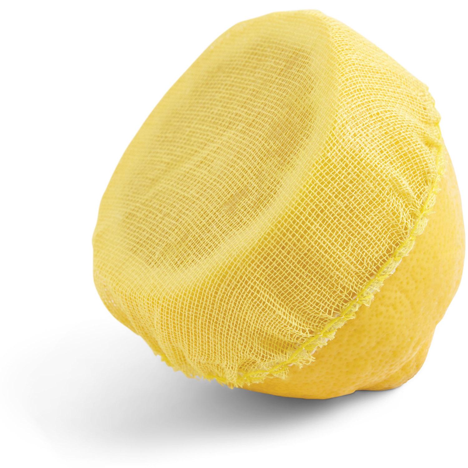 These handy cotton wraps contain seeds from lemon halves with every squeeze. Measuring 2" in diameter, each wrap fits over the cut side of a lemon half, letting you enjoy fresh-squeezed lemon juice without picking out seeds. The wraps fit small to medium lemons, and also work great with limes, blood oranges, and other small citrus fruit. Set of 18 wraps.