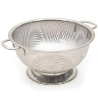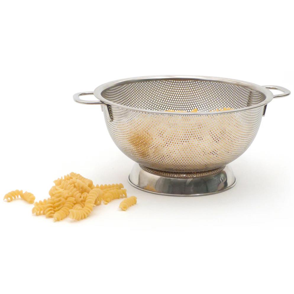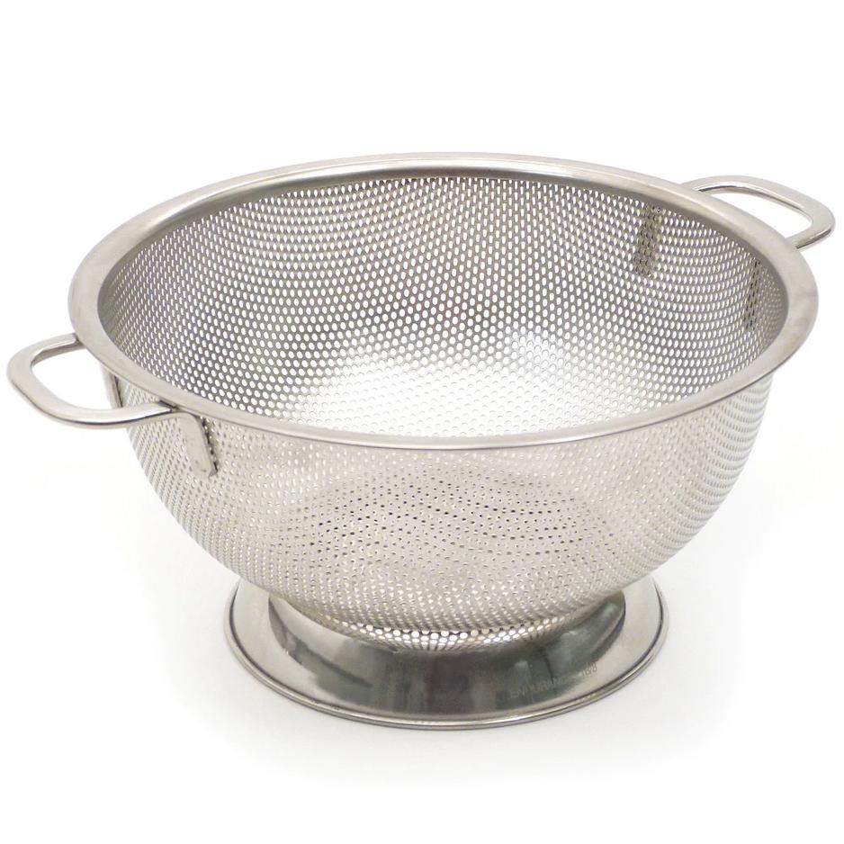 Covered from top to bottom with tiny, precision-pierced holes, this stainless colander has long been a favorite of the folks at Cook's Illustrated. It drains so thoroughly that not even the smallest of orzo or angel hair pasta will escape, nor will a drop of liquid remain colander when rinsing. The wide-rim base holds the colander above the floor of the sink and provides stability when rinsing. Made of superior-quality 18/8 stainless steel with a smooth, polished, corrosion-resistant surface, this colander measures 10.75" in diameter and 5.25" tall.