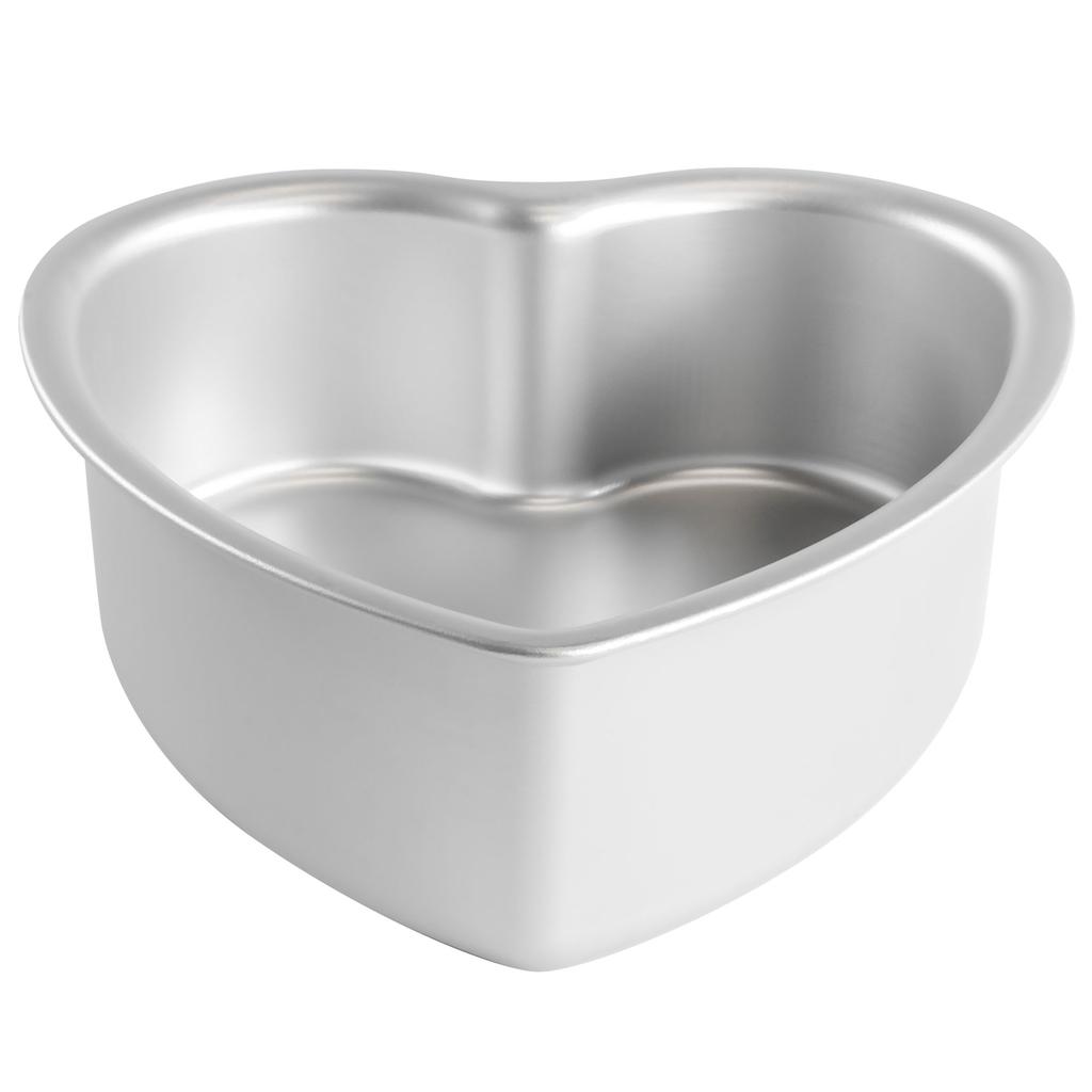 This heart-shaped cake pan measures 8" x 8" x 3" high. Fat Daddio's' pans are made from aluminum, essential for uniform heat distribution and the even rising and baking of baked goods. The pros bake only in aluminum. But Fat Daddio's pans are made from premium 3003 aluminum alloy that, unlike other aluminum bakeware, has been anodized. Anodizing is a safe, environmentally-friendly process that thickens, toughens and seals the naturally-occuring protective oxide found on aluminum. Fat Daddio's pans simply will not interact with even the most acidic foods. They won't peel, chip, flake, discolor, or chalk. Not only this, Fat Daddio's pans come with a lifetime warranty. The only thing to note is that Fat Daddio's pans should be hand washed if you want to maintain the appearance; the dishwasher will cause discoloration that is cosmetic only, and will not affect performance.